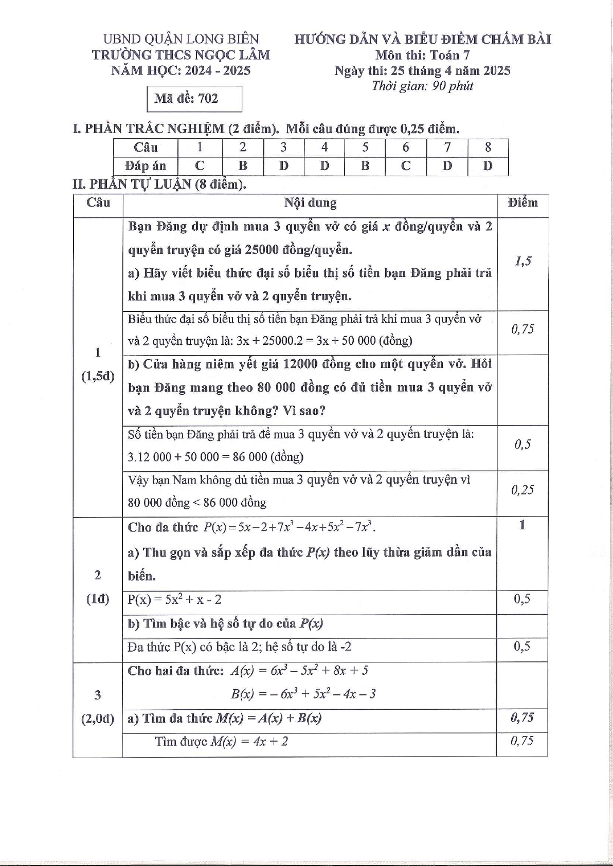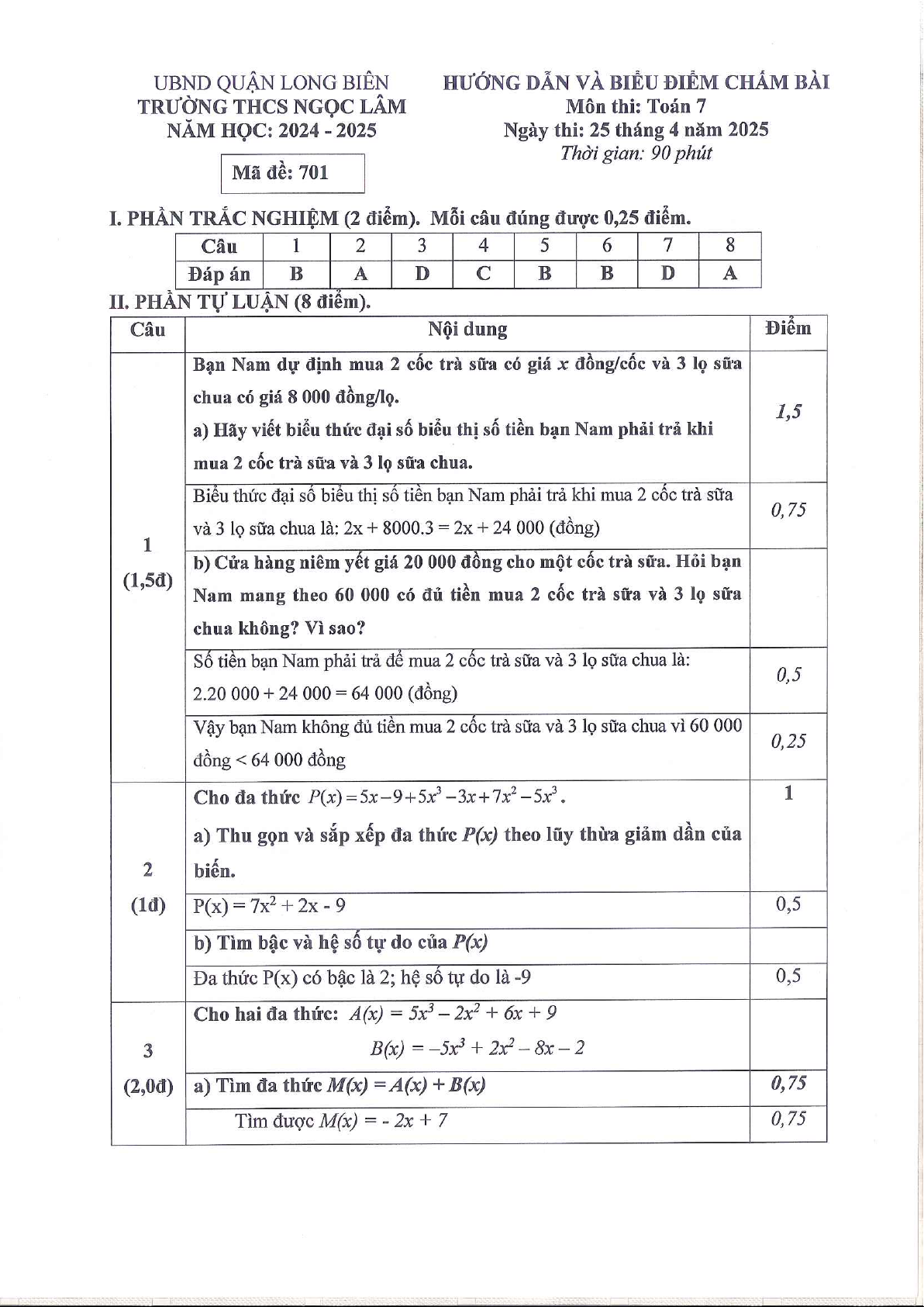 Giới thiệu đến quý thầy, cô giáo và các em học sinh lớp 7 đề kiểm tra cuối học kì 2 môn Toán 7 năm học 2024 – 2025 trường THCS Ngọc Lâm, quận Long Biên, thành phố Hà Nội. Kỳ thi được diễn ra vào ngày 25 tháng 04 năm 2025. Đề thi có đáp án, lời giải chi tiết và hướng dẫn chấm điểm.