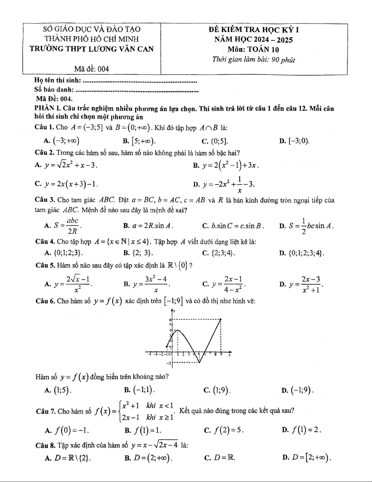 Đề học kỳ 1 Toán 10 năm 2024 – 2025 trường THPT Lương Văn Can – TP HCM