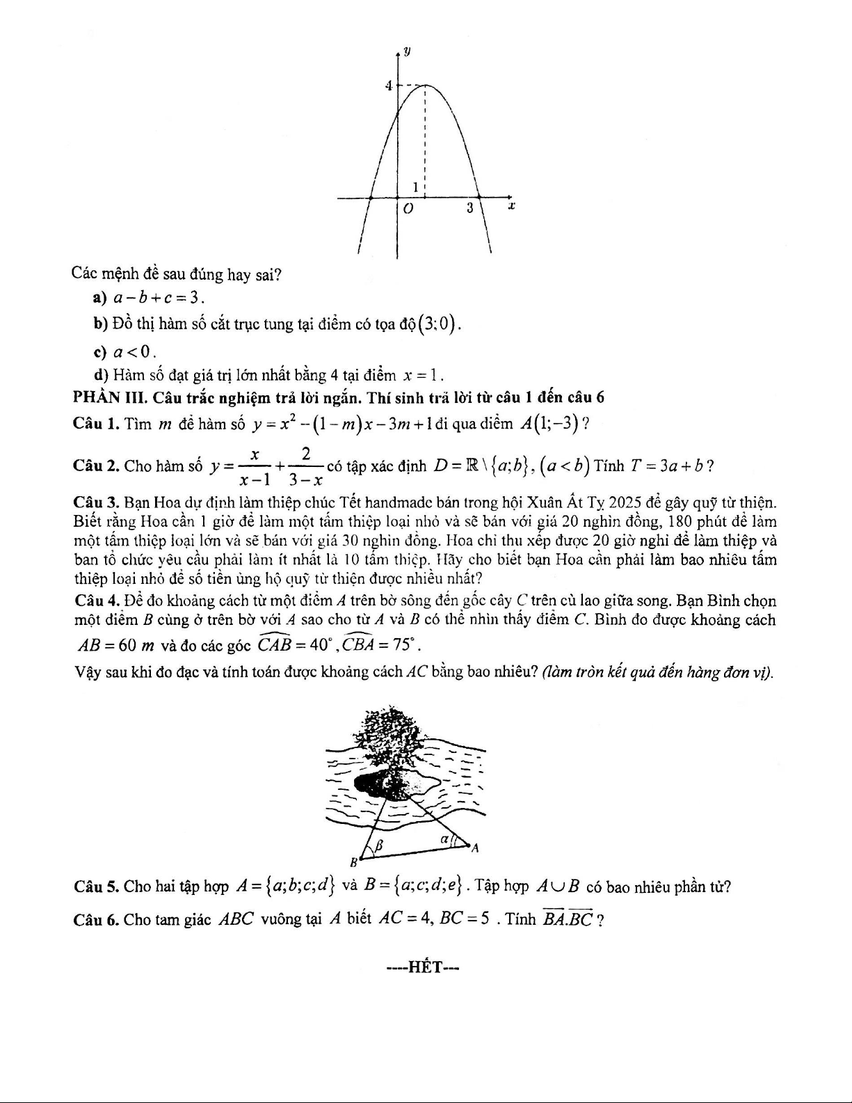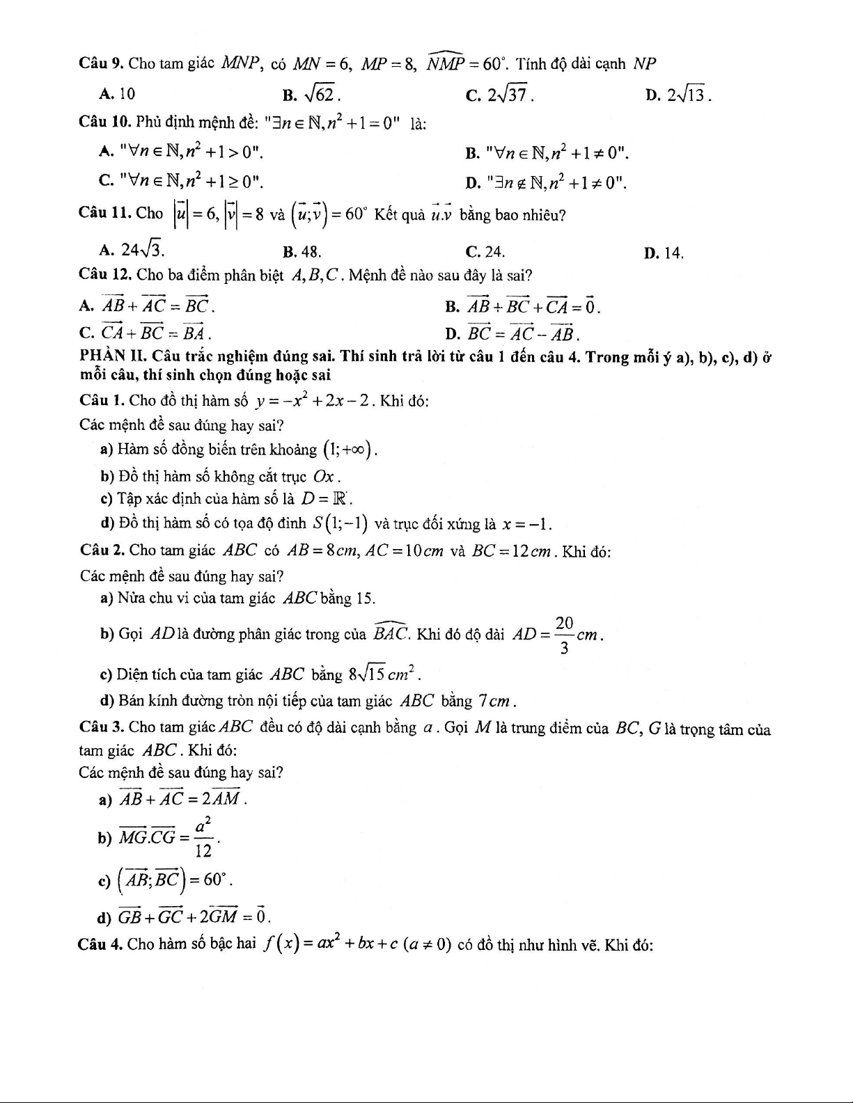 Giới thiệu đến quý thầy, cô giáo và các em học sinh lớp 10 đề kiểm tra cuối học kỳ 1 môn Toán 10 năm học 2024 – 2025 trường THPT Lương Văn Can, thành phố Hồ Chí Minh. Đề thi gồm 12 câu trắc nghiệm nhiều phương án lựa chọn + 04 câu trắc nghiệm đúng sai + 06 câu trắc nghiệm trả lời ngắn, thời gian làm bài 90 phút.