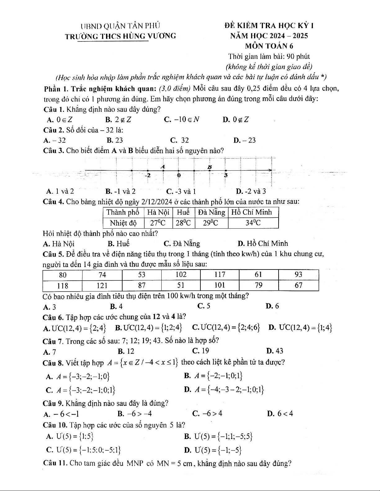 Đề học kỳ 1 Toán 6 năm 2024 – 2025 trường THCS Hùng Vương – TP HCM
