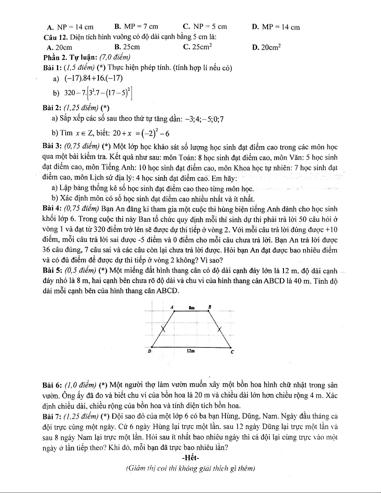 Giới thiệu đến quý thầy, cô giáo và các em học sinh lớp 6 đề kiểm tra cuối học kỳ 1 môn Toán 6 năm học 2024 – 2025 trường THCS Hùng Vương, quận Tân Phú, thành phố Hồ Chí Minh. Đề thi gồm 02 trang, cấu trúc 30% trắc nghiệm (12 câu) kết hợp 70% tự luận (07 câu), thời gian làm bài 90 phút.