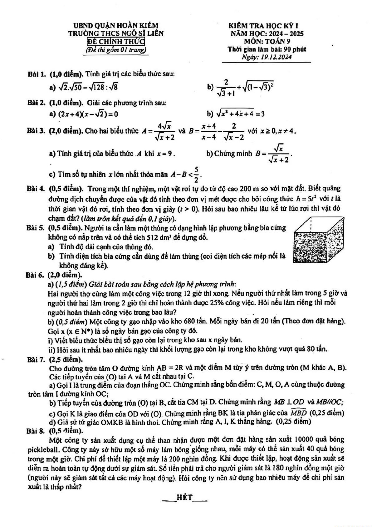 Giới thiệu đến quý thầy, cô giáo và các em học sinh lớp 9 đề kiểm tra cuối học kỳ 1 môn Toán 9 năm học 2024 – 2025 trường THCS Ngô Sĩ Liên, quận Hoàn Kiếm, thành phố Hà Nội. Kỳ thi được diễn ra vào thứ Năm ngày 19 tháng 12 năm 2024.