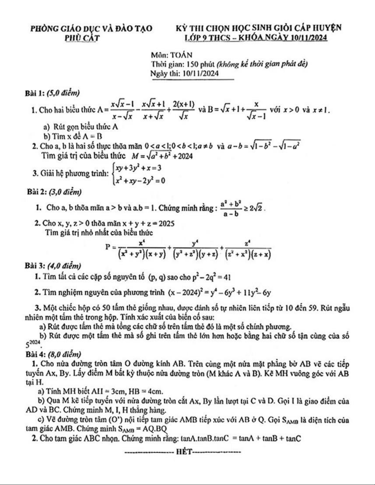 Đề học sinh giỏi cấp huyện Toán 9 năm 2024 – 2025 phòng GD&ĐT Phù Cát – Bình Định