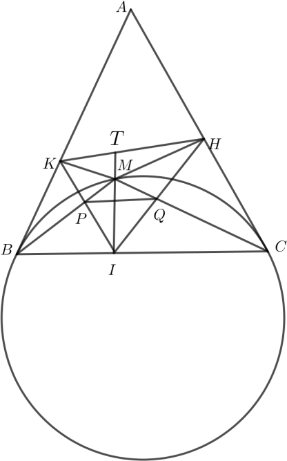 Q là giao điểm của hai đường thẳng MC và IH , T là giao điểm của hai đường thẳng HK và MI .
