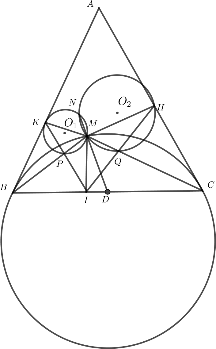 lần lượt tại B, C. Trên cung BC nằm trong tam giác ABC lấy điểm M ( M khác B, C ). Gọi I , H , K