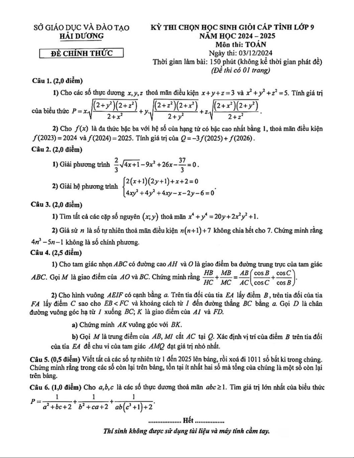 Đề học sinh giỏi cấp tỉnh Toán 9 năm 2024 – 2025 sở GD&ĐT Hải Dương