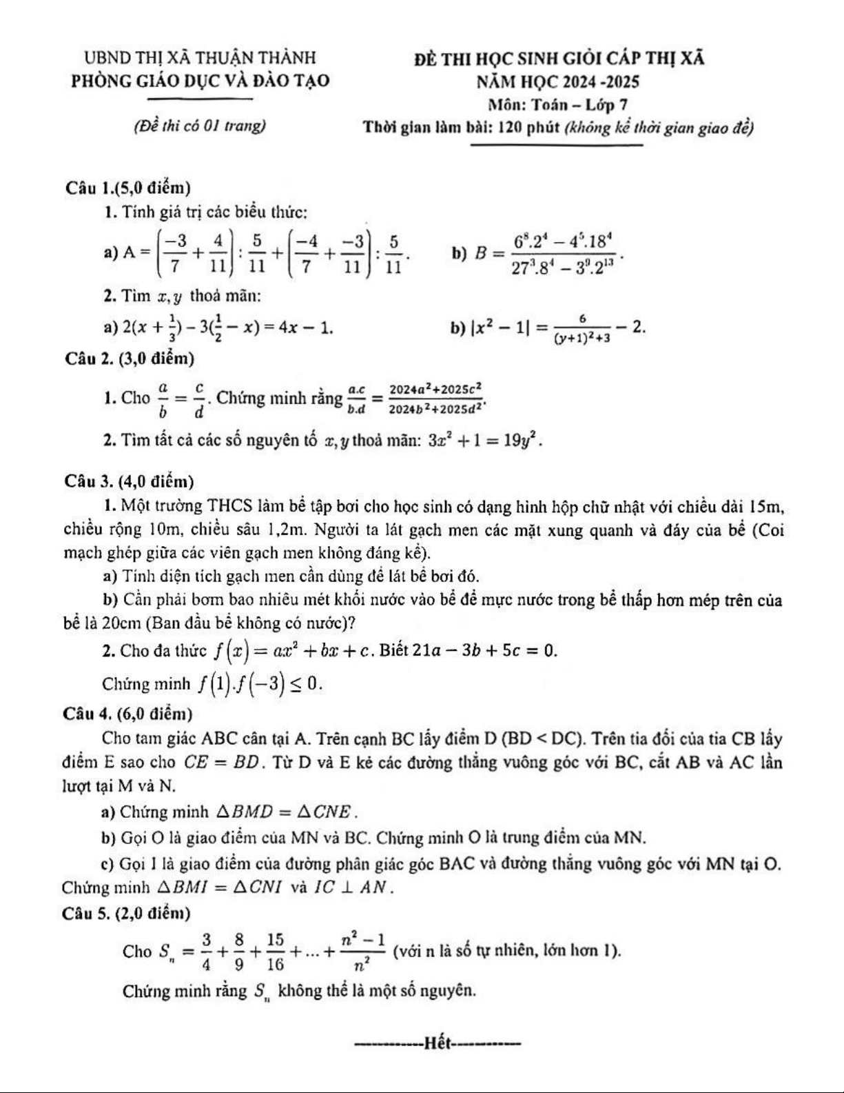 Đề học sinh giỏi Toán 7 năm 2024 – 2025 phòng GD&ĐT Thuận Thành – Bắc Ninh