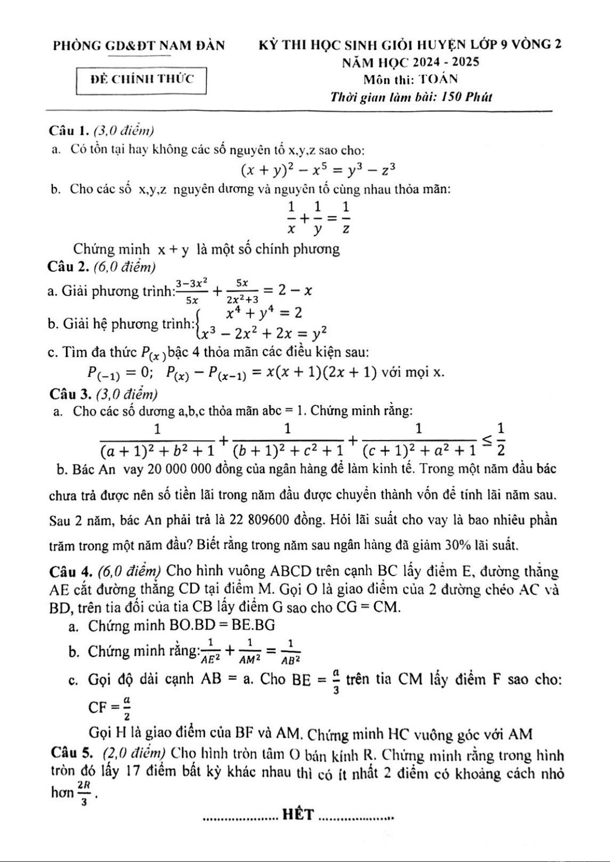 Đề HSG huyện Toán 9 vòng 2 năm 2024 – 2025 phòng GD&ĐT Nam Đàn – Nghệ An