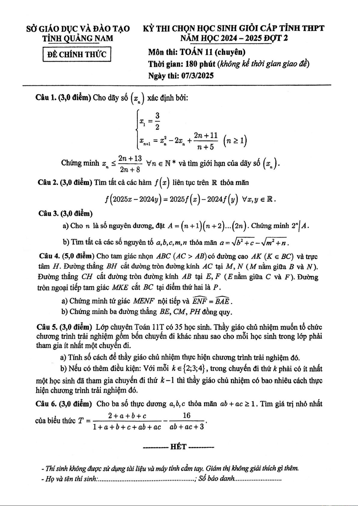 Đề HSG tỉnh Toán 11 (chuyên) năm 2024 – 2025 đợt 2 sở GD&ĐT Quảng Nam