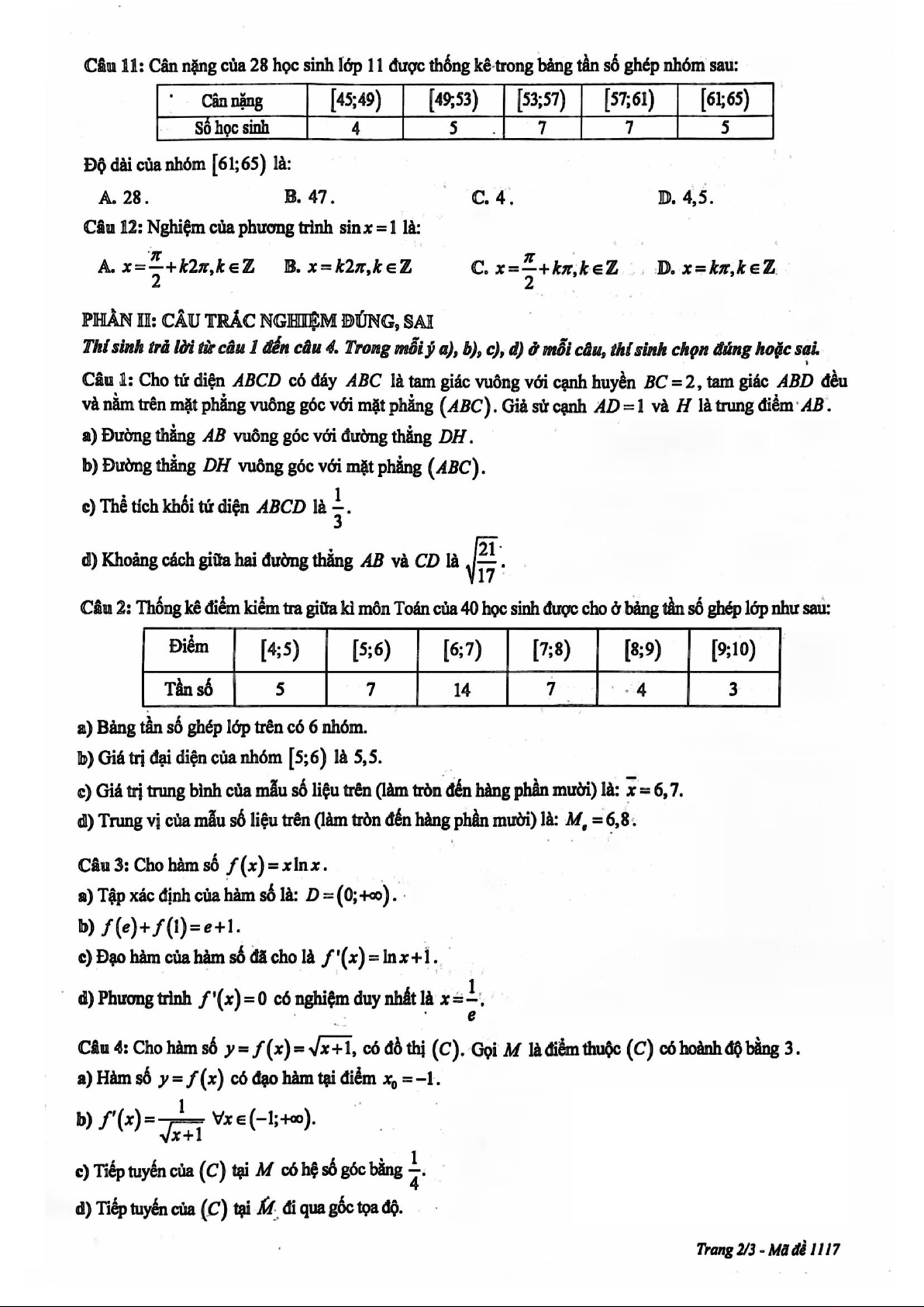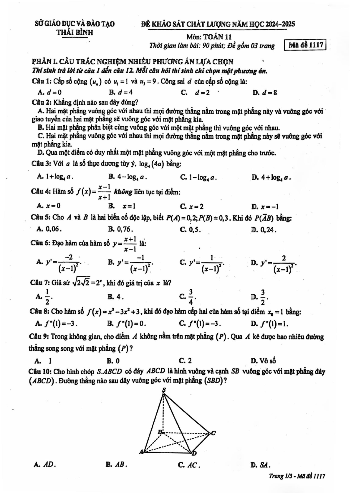 Giới thiệu đến quý thầy, cô giáo và các em học sinh lớp 11 đề khảo sát chất lượng môn Toán 11 năm học 2024 – 2025 sở Giáo dục và Đào tạo tỉnh Thái Bình. Đề thi có đáp án mã đề 1117.