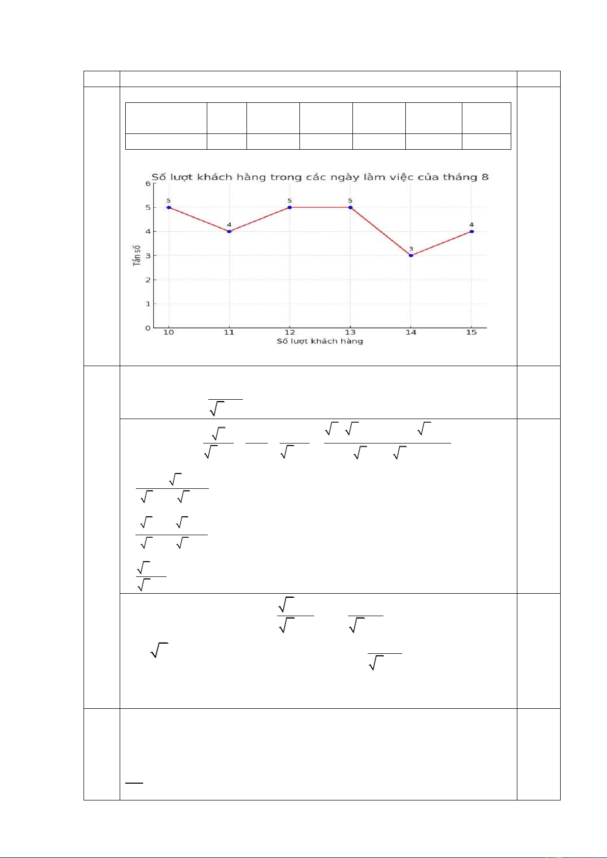 ĐÁP ÁN VÀ BIỂU ĐIỂM  Bài  Nội dung  Điểm  I.  1) Bảng tần số:    Số lượt  10  11  12  13  14  15  0,75  khách hàng    Tần số  5  4  5  5  3  4