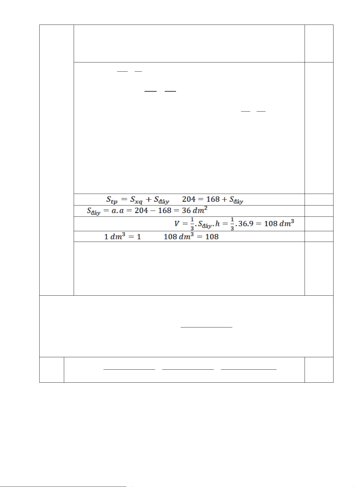 +) Thể tích của hình chóp bằng: 0,5 +) Ta có lít nên lít nước 0,25