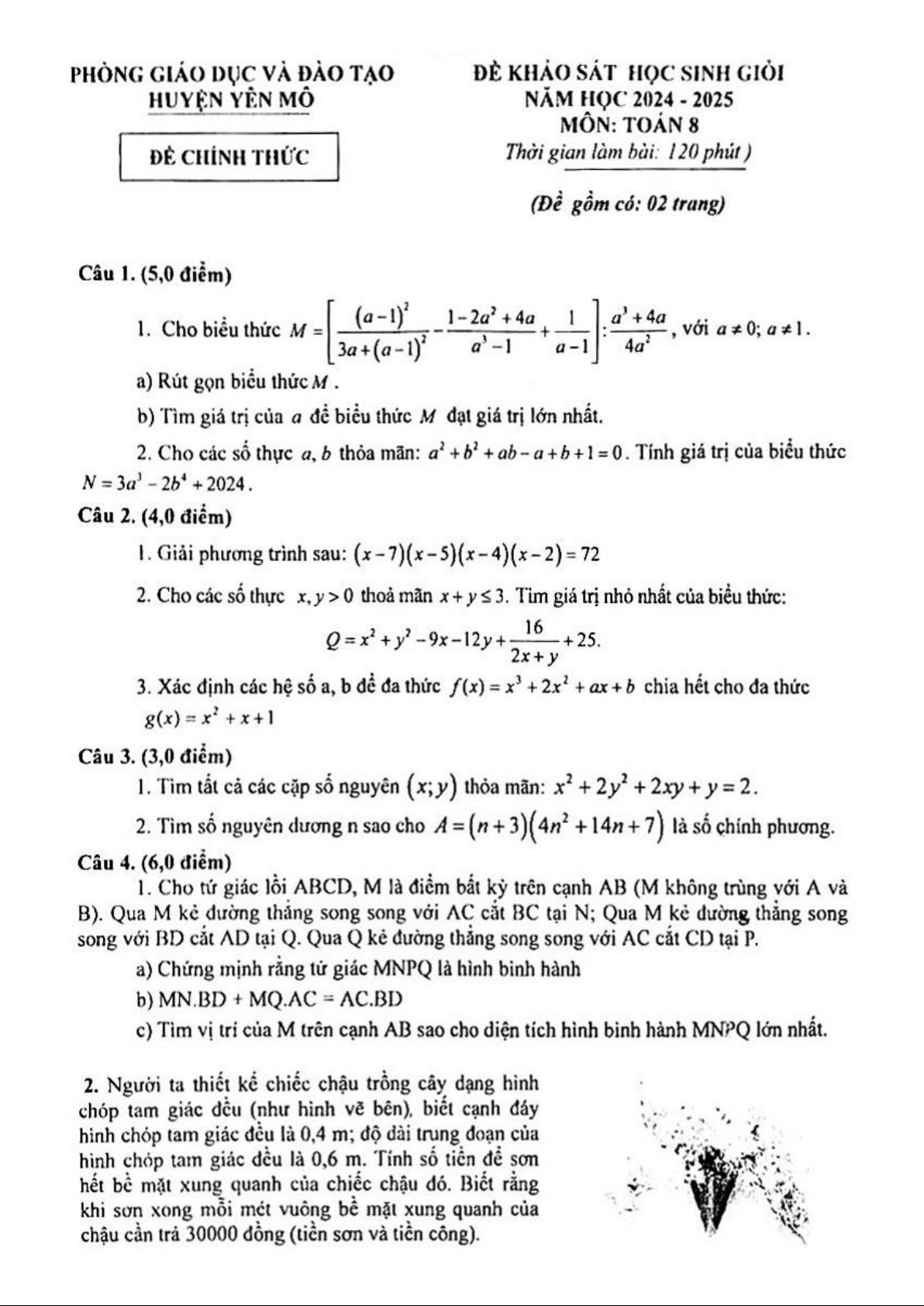 Đề khảo sát HSG Toán 8 năm 2024 – 2025 phòng GD&ĐT Yên Mô – Ninh Bình