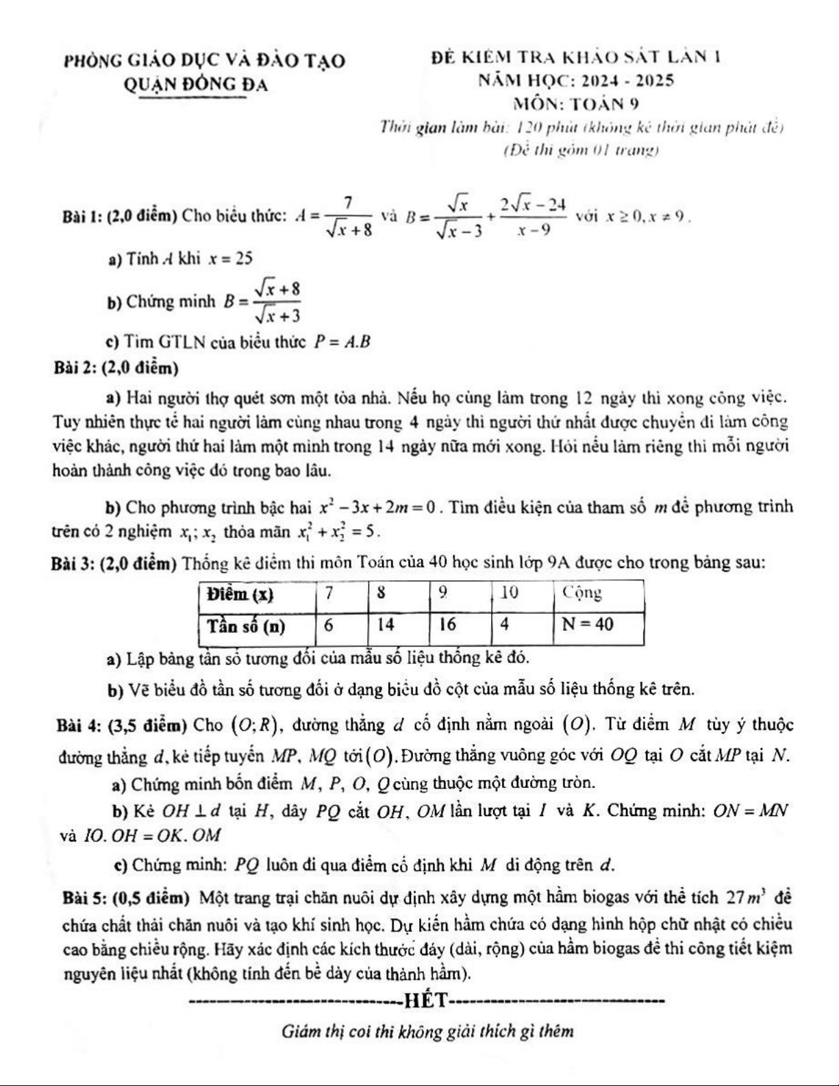 Đề khảo sát lần 1 Toán 9 năm 2024 – 2025 phòng GD&ĐT Đống Đa – Hà Nội