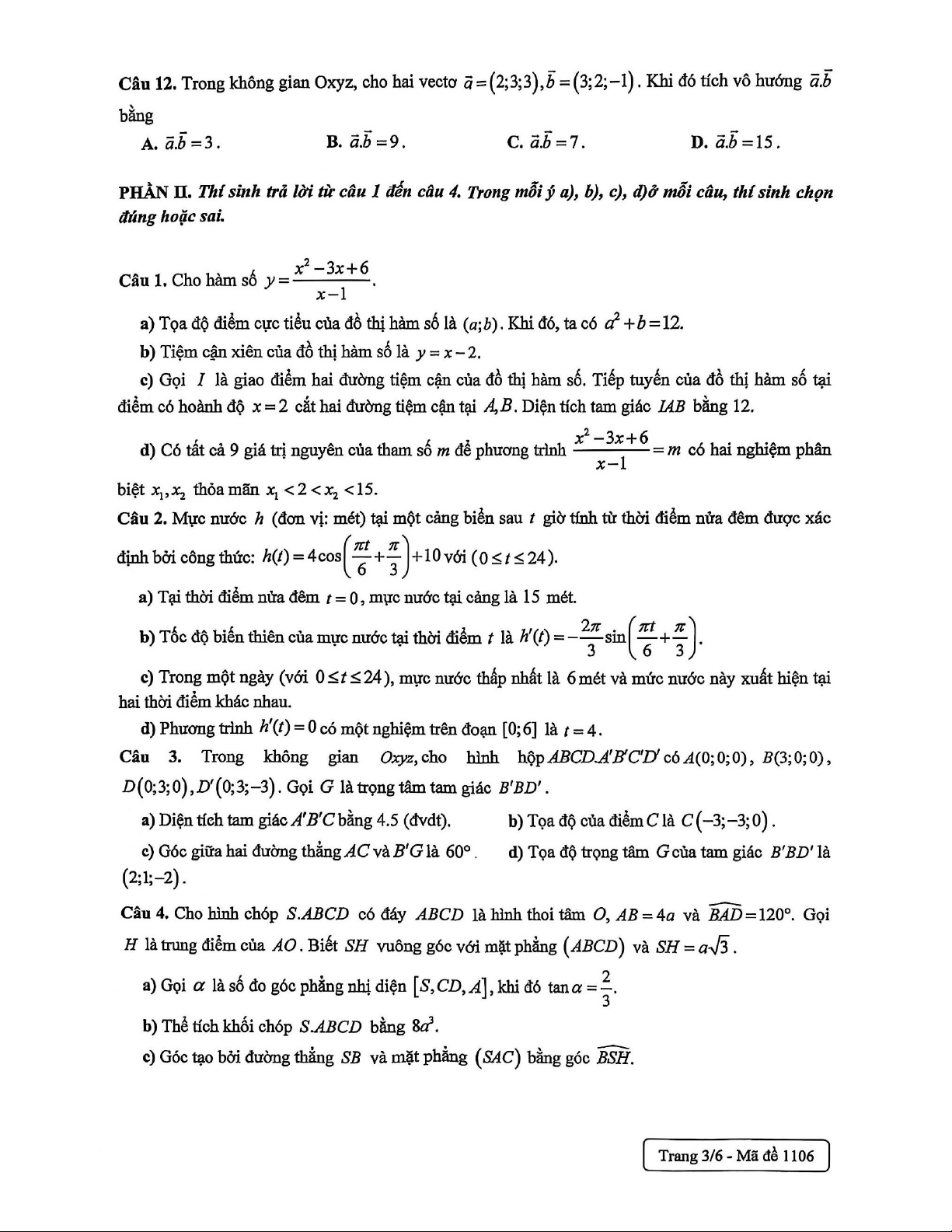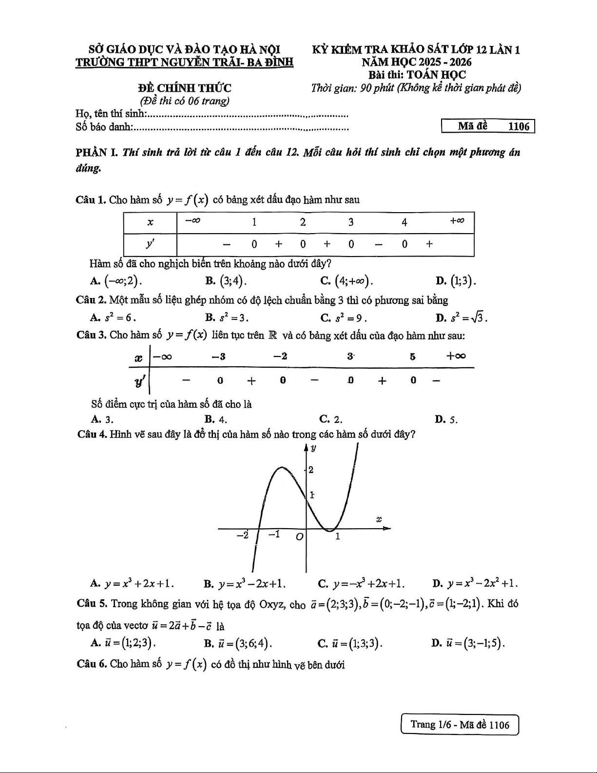 Đề khảo sát Toán 12 lần 1 năm 2025 – 2026 trường THPT Nguyễn Trãi – Hà Nội