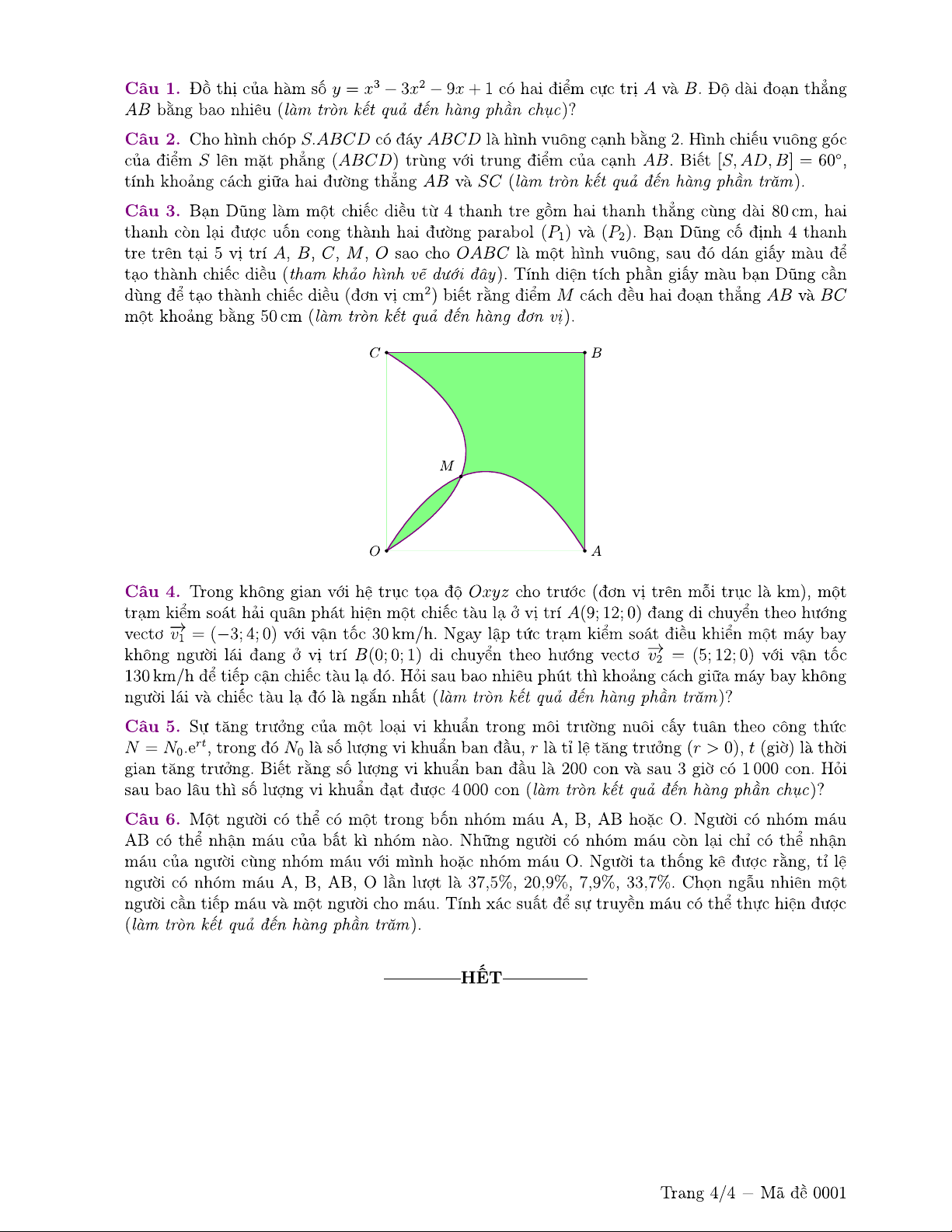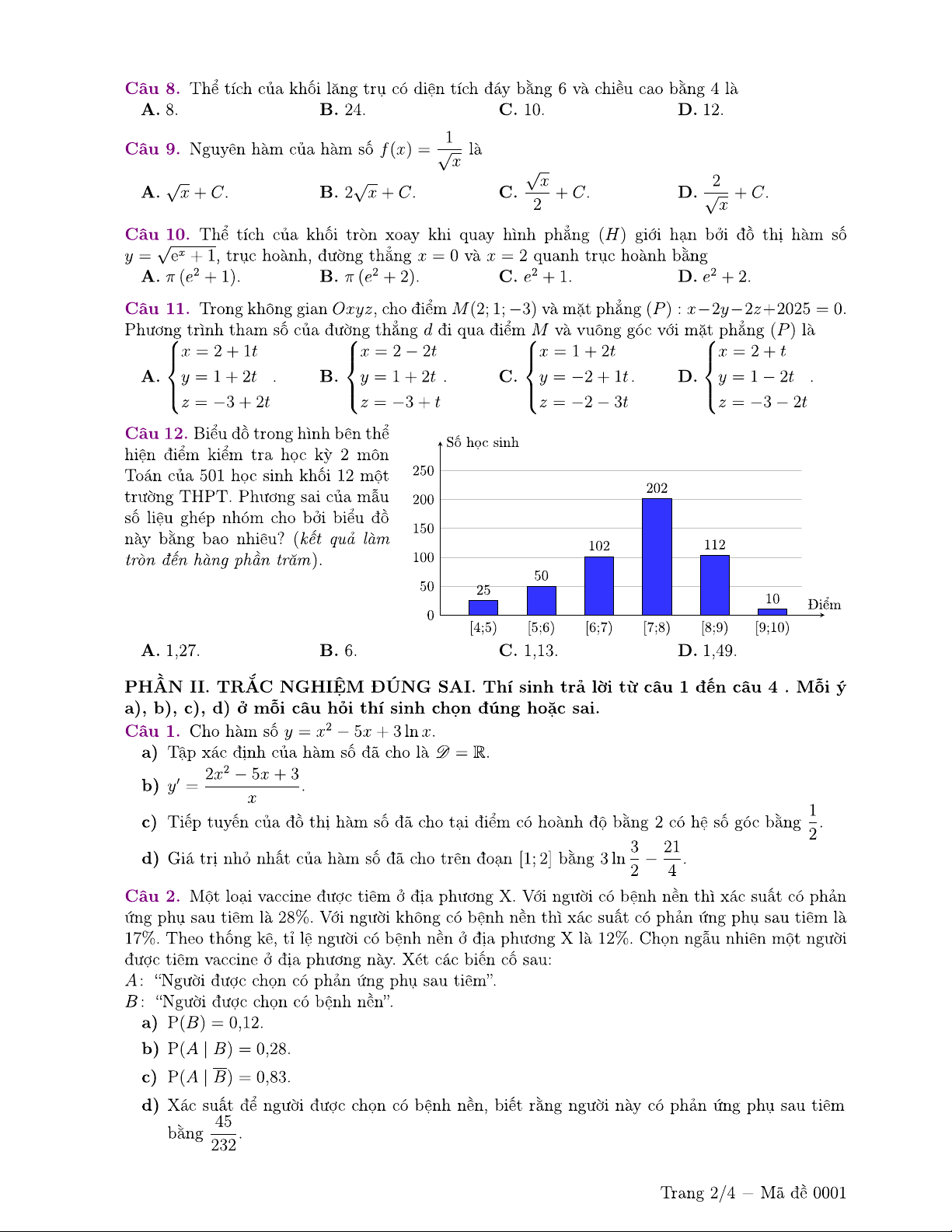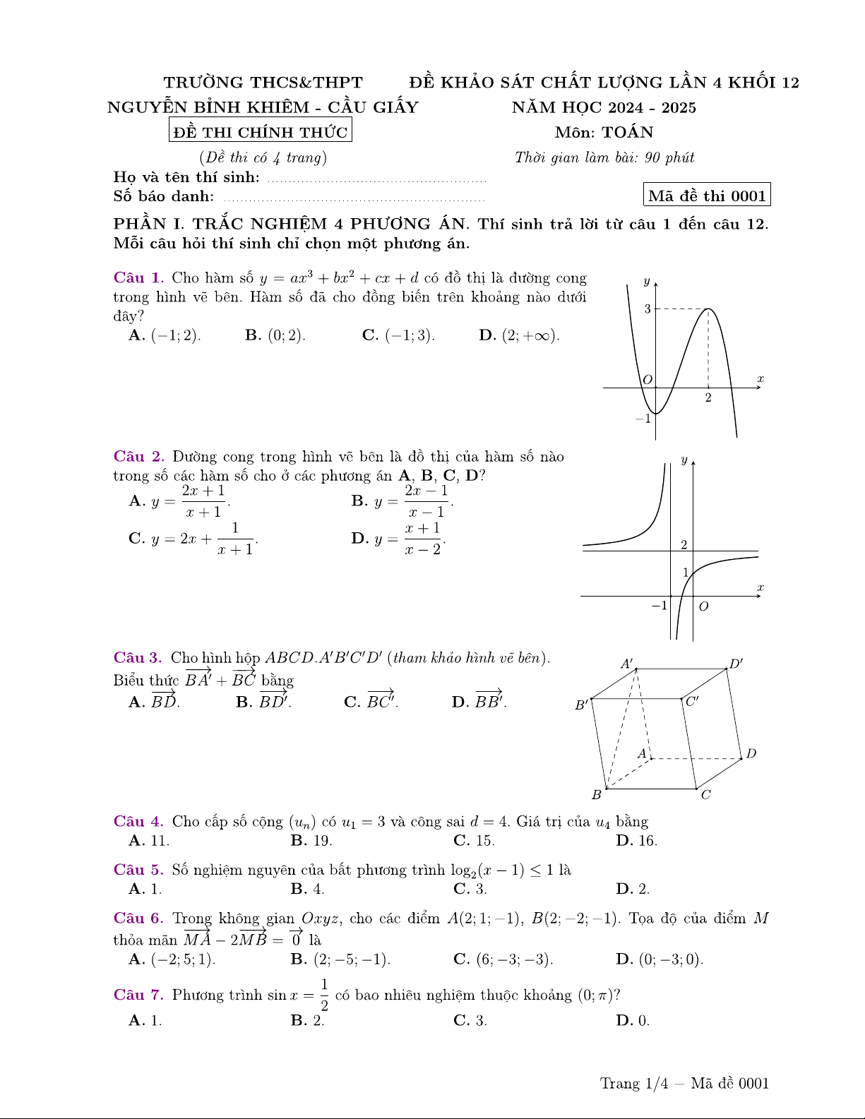 Giới thiệu đến quý thầy, cô giáo và các em học sinh đề khảo sát chất lượng môn Toán 12 lần 4 năm học 2024 – 2025 trường THCS & THPT Nguyễn Bỉnh Khiêm, quận Cầu Giấy, thành phố Hà Nội. Đề thi có đáp án mã đề 0001.