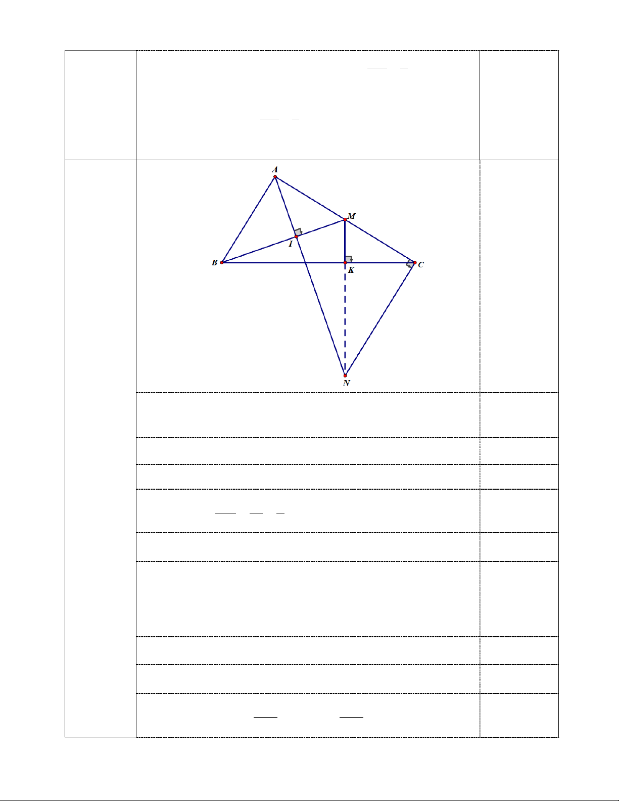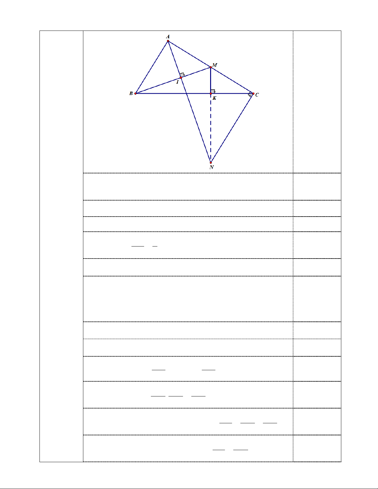 BC = AB + AC 2 2 2 BC = 9 +12 = 225 0,25 điểm BC =15cm 0,25 điểm Ý 2 0,25 điểm Ta có AC 4 sin B = = 3 điểm BC 5 0 B ≈ 53 0,25 điểm b) Xét A ∆ MB và IMA ∆ có: = 0 BAM AIM = 90 AMB chung 0,5 điểm Suy ra ∆ M A B IM ∆ ( A g.g) 0,25 điểm Suy ra = ABM IAM Lập luận AM = cos ;cos MI AMB AMI = 0,25 điểm BM AM Ta có 2 cos AM = . IM IM AMM = 0,25 điểm BM AM BM c) Chứng minh: A ∆ MB AB AM CM ∆ ( CNA g.g) ⇒ = = (1) AC CN CN Chứng minh: ABC ∆ AB KM K