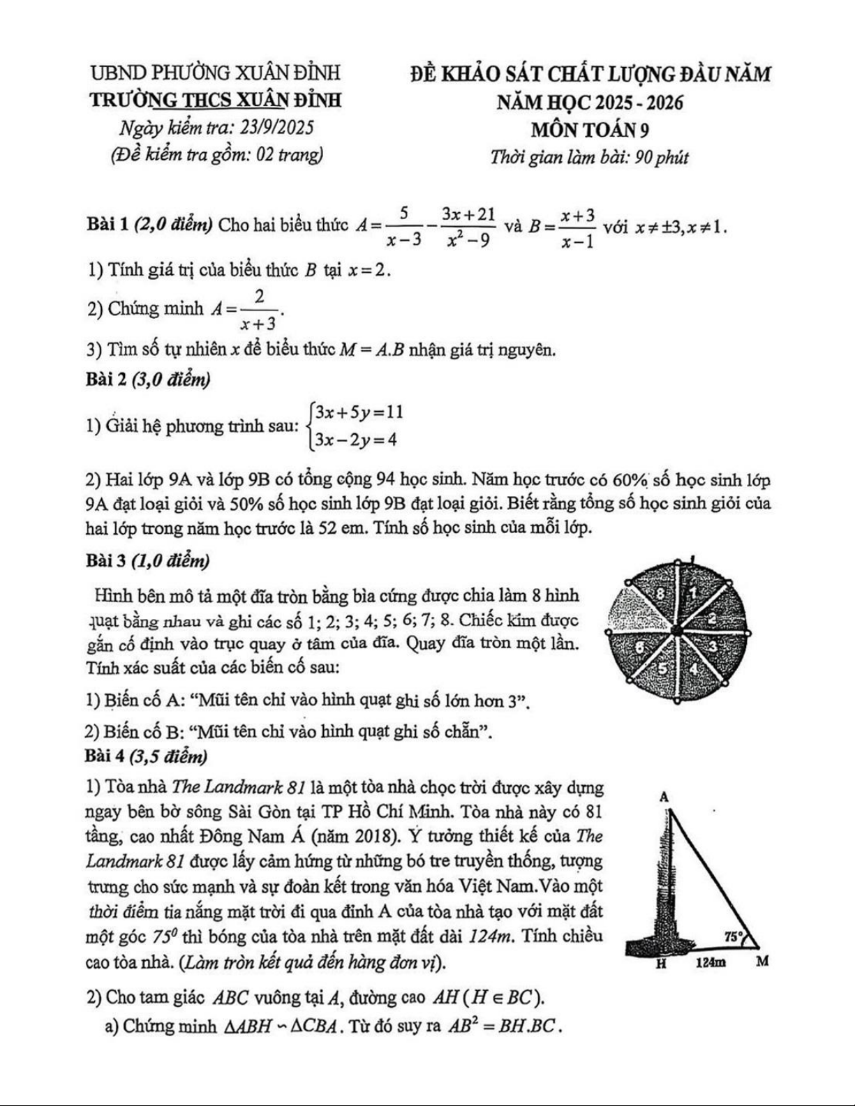 Đề khảo sát Toán 9 đầu năm 2025 – 2026 trường THCS Xuân Đỉnh – Hà Nội