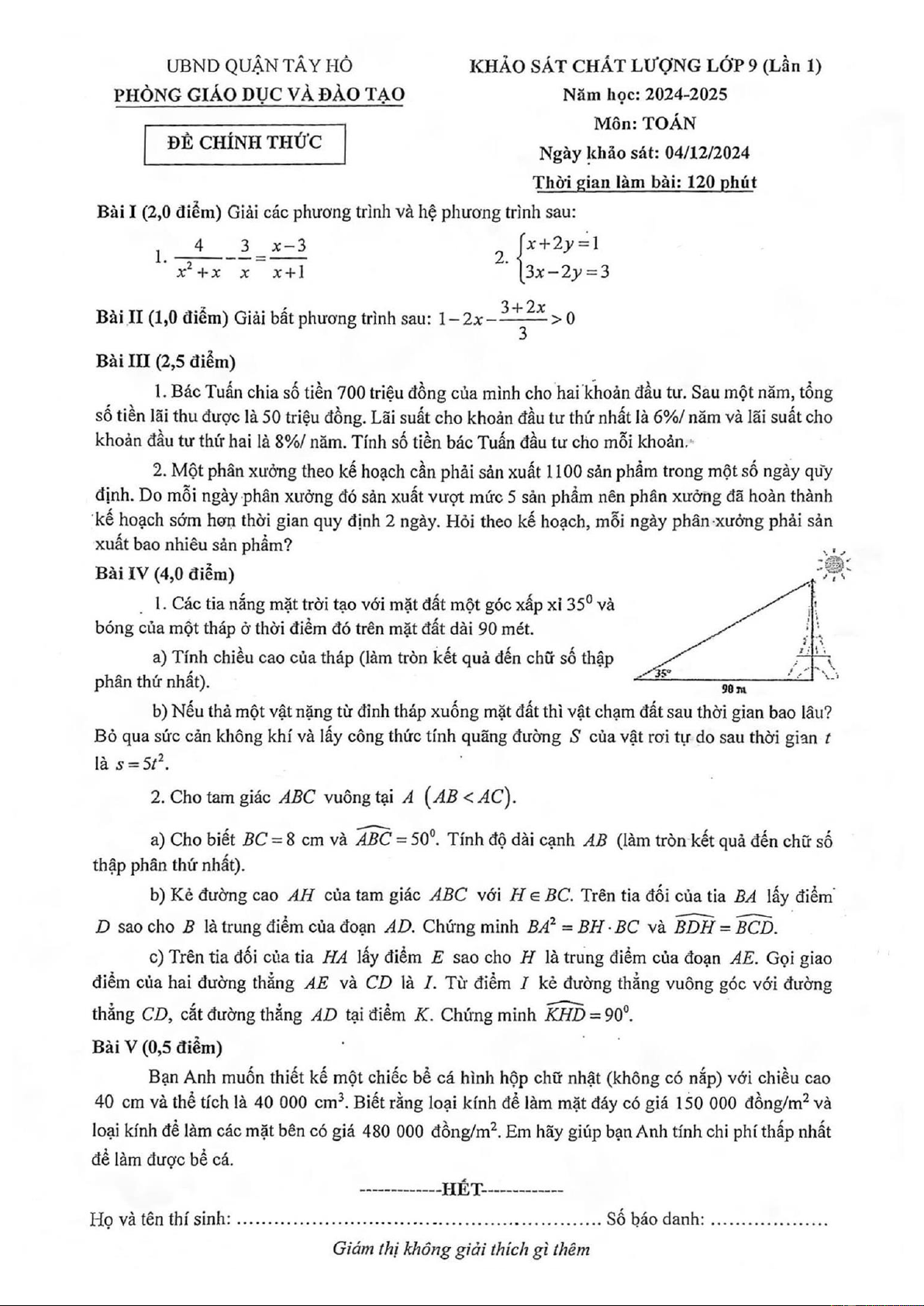 Đề khảo sát Toán 9 lần 1 năm 2024 – 2025 phòng GD&ĐT Tây Hồ – Hà Nội