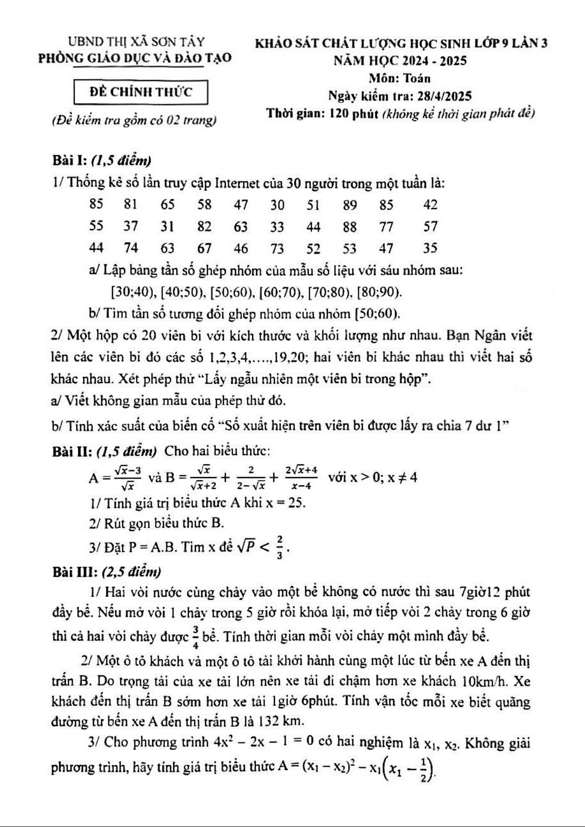 Đề khảo sát Toán 9 lần 3 năm 2024 – 2025 phòng GD&ĐT Sơn Tây – Hà Nội