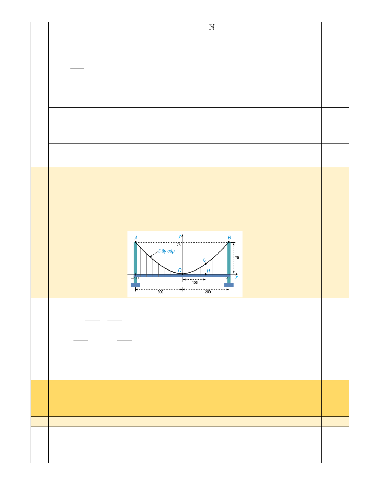Vậy chiều cao của dây cáp tại điểm cách tâm của cây cầu 100 m  là 18,75m .