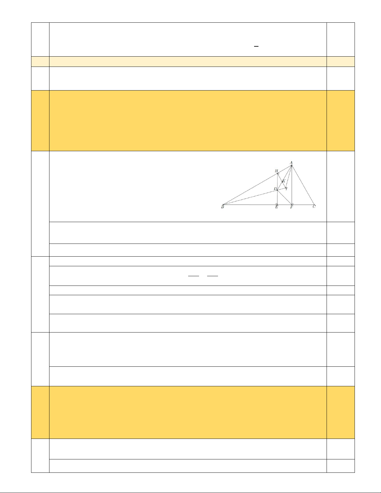 B ED = HI.EB .  0,25  EB ED Suy ra được 𝐵𝐷𝐸 ̂ = 𝐻𝐼𝐵 ̂ b)    0,25  Ta có 𝐻𝐷 ̂𝐼 = 𝐵𝐷𝐸 ̂  𝐻𝐷 ̂𝐼 = 𝐻𝐼𝐷 ̂ suy ra HDI   cân tại H   suy ra  0,25  HD = HI. (1)  Mặt khác A