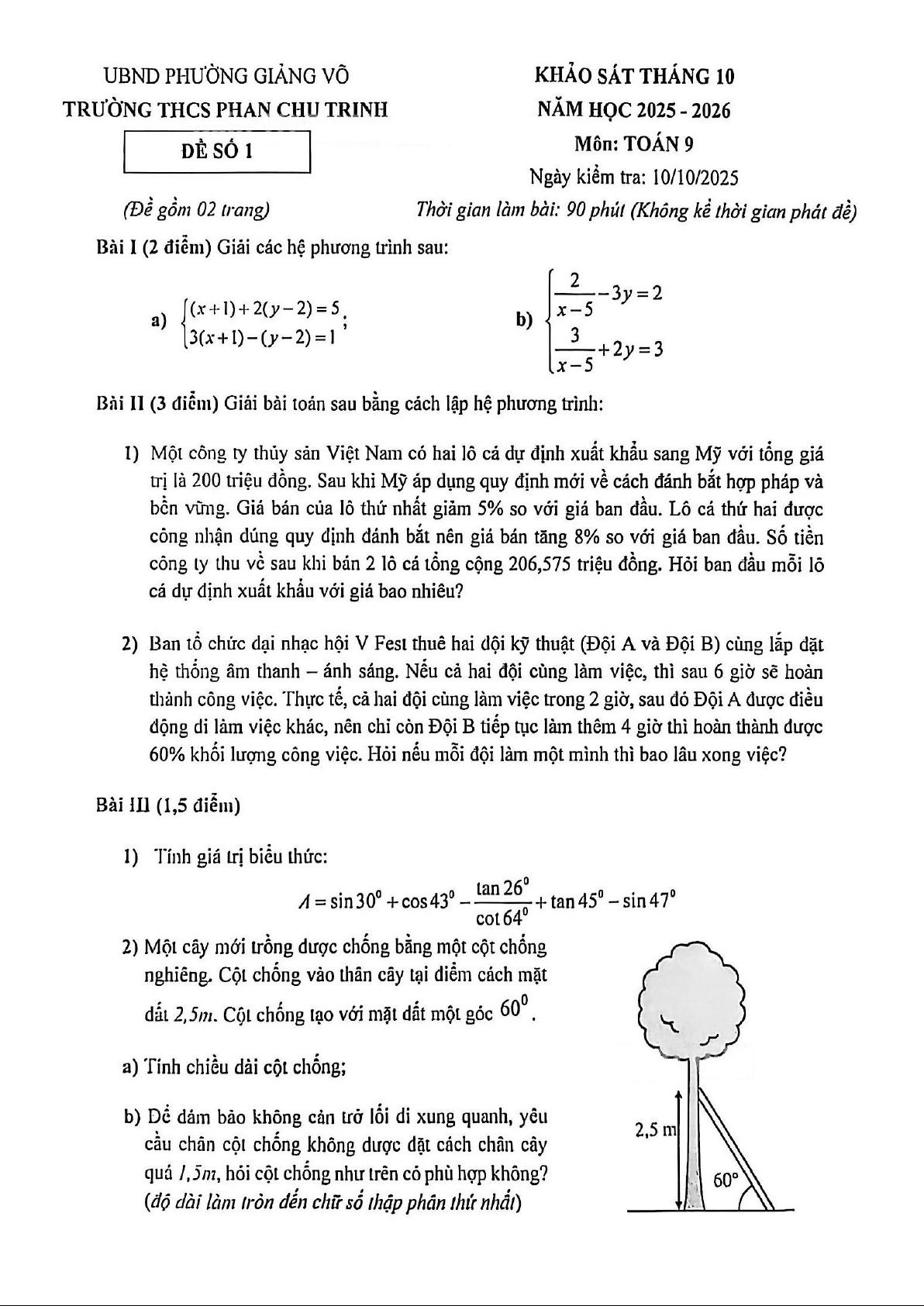 Đề khảo sát Toán 9 tháng 10 năm 2025 trường THCS Phan Chu Trinh – Hà Nội
