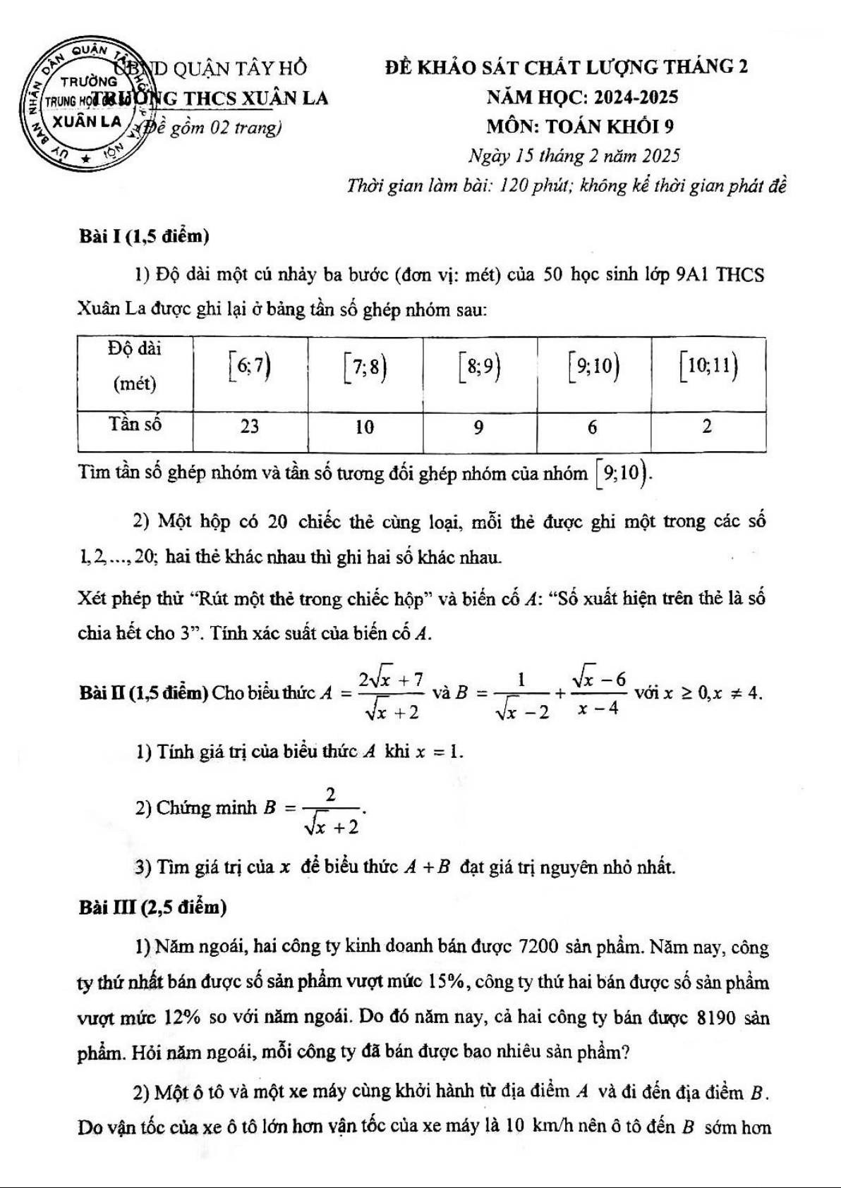 Đề khảo sát Toán 9 tháng 2 năm 2025 trường THCS Xuân La – Hà Nội