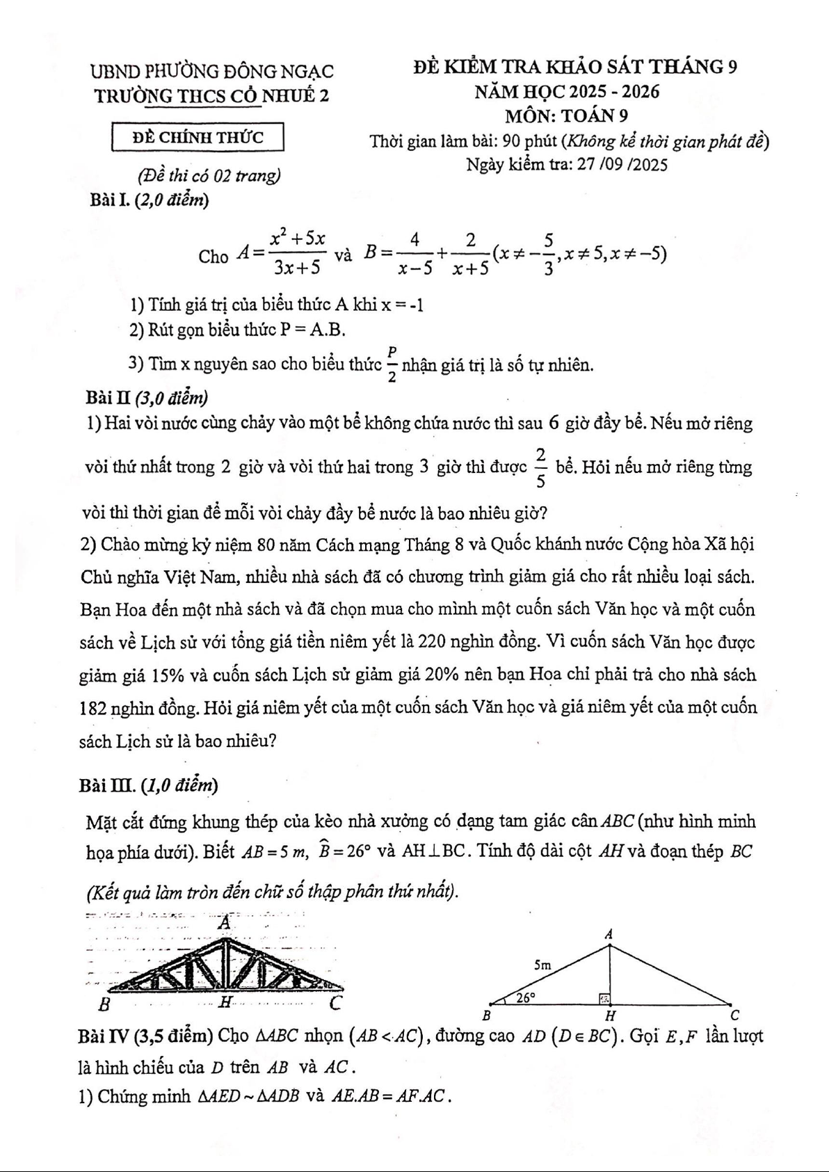 Đề khảo sát Toán 9 tháng 9 năm 2025 trường THCS Cổ Nhuế 2 – Hà Nội