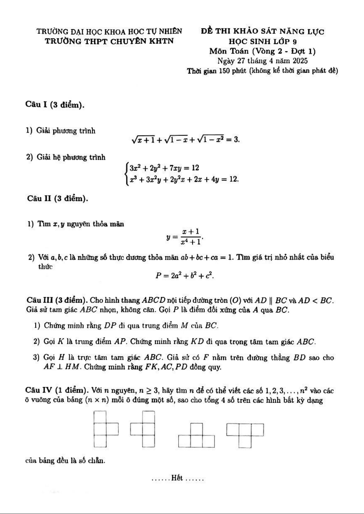 Giới thiệu đến quý thầy, cô giáo và các em học sinh lớp 9 đề thi khảo sát năng lực học sinh môn Toán 9 vòng 2 đợt 1 năm học 2024 – 2025 trường THPT chuyên KHTN, thành phố Hà Nội. Kỳ thi được diễn ra vào ngày 27 tháng 04 năm 2025. Đề thi có đáp án và lời giải chi tiết.