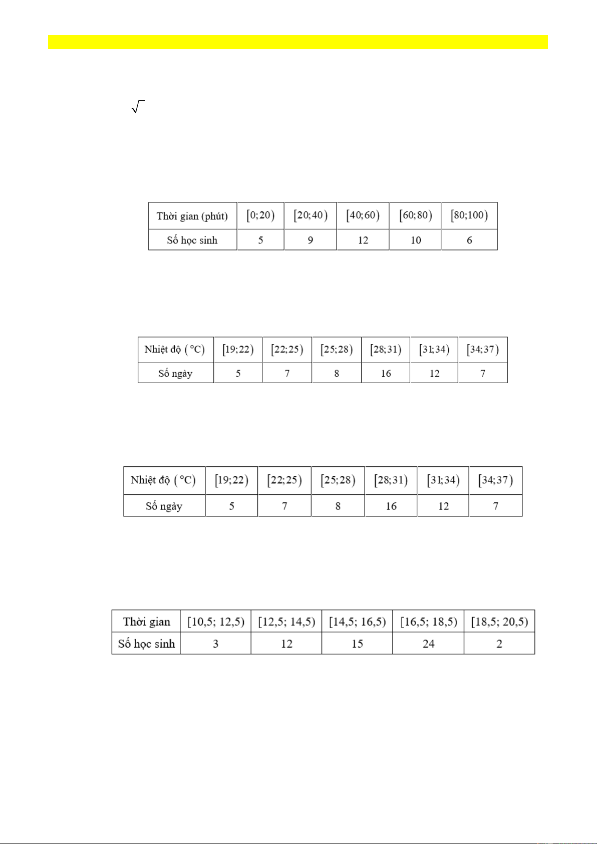 Câu 7: Số tiết tự học tại nhà trong 1 tuần (tiết/tuần) của 20 học sinh lớp 10 trường THPT A được ghi lại như sau: