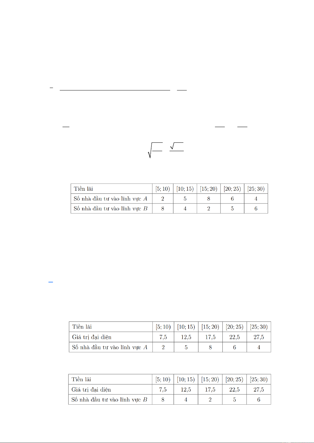 Độ lệch chuẩn của hai lĩnh vực A và B là 1 s = . + + + + − = A ( 2 2 2 2 2 2.7,5 5.12,5 8.17,5 6.22,5 4.27,5 ) 2 18,5 5,8 25 1 s = . + + + + − = B ( 2 2 2 2 2 8.7,5 4.12,5 2.17,5 5.22,5 6.27,5 ) 2 16,9 8,04. 25