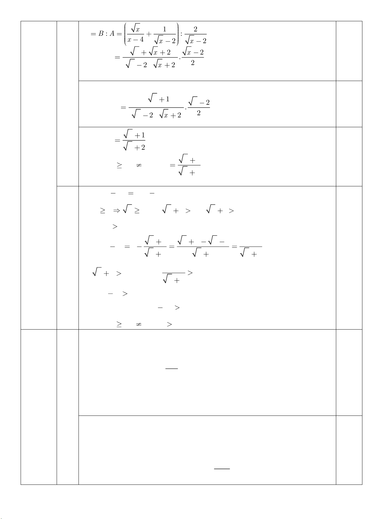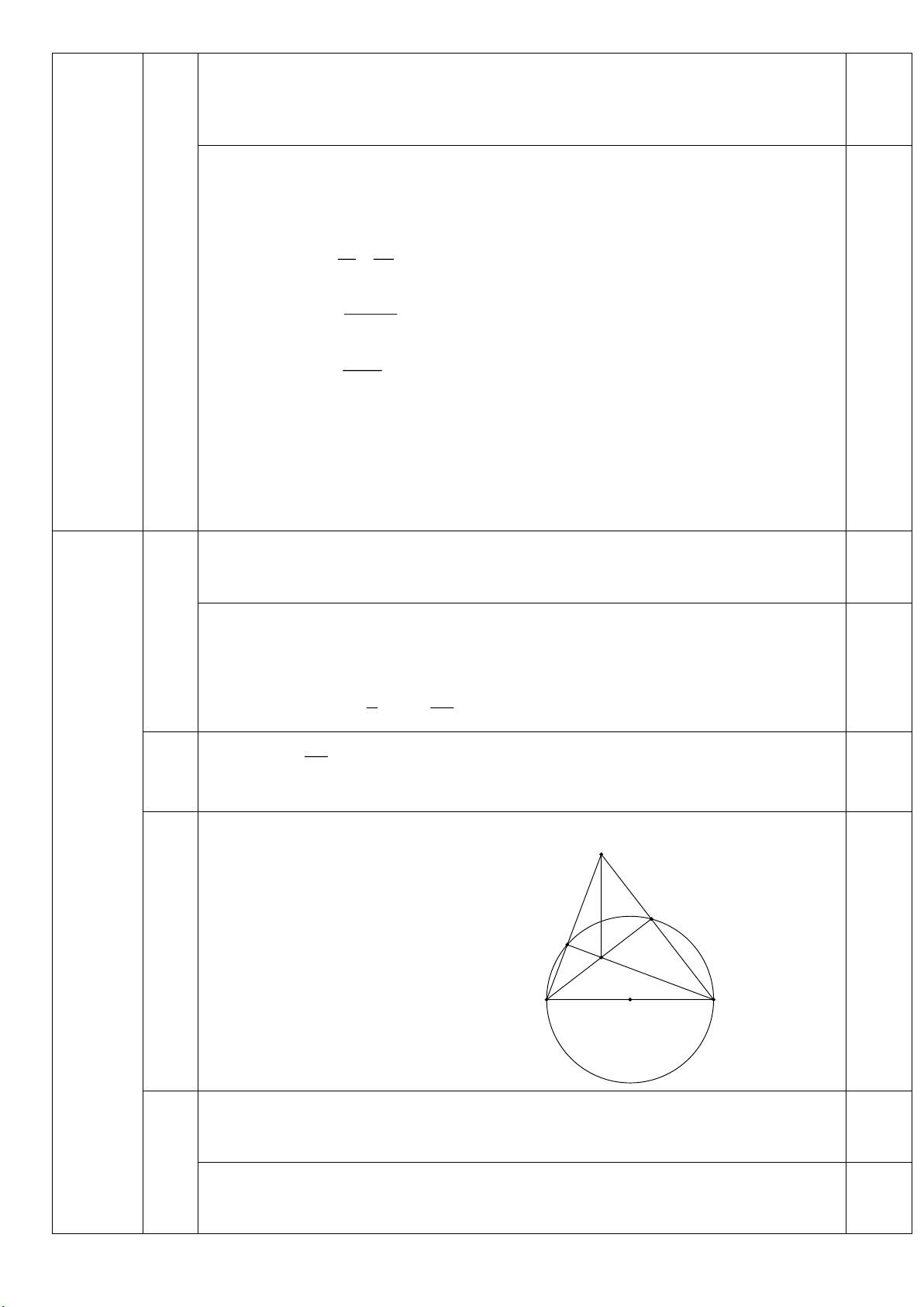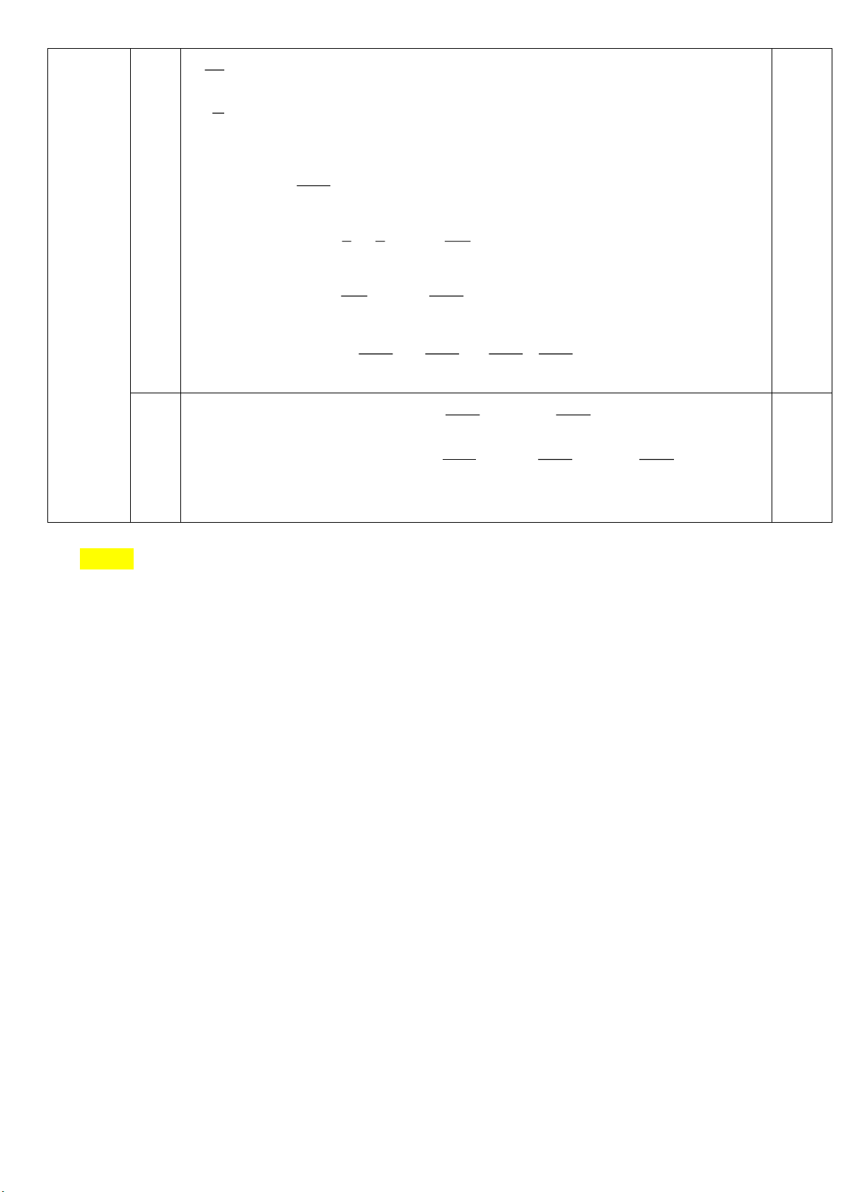 9 TMÐK vào biểu thức A ta được: (1,5 điểm) 2 2 A 1 3 2 0,25 9 2 Vậy A 1 khi x 9 Với x 0;x 4 ta có: 0,25 2) x 1 2 P B : A : x 4 x 2 x 2 x x 2 x 2 . 2 x 2 x 2 2 x 1 x 2 . 2 0,25 x 2 x 2 x 1 x 2 x 1 0,25 Vậy với x 0;x 4 thì P x 2 3) Ta có: 2 P P P 1 P do x 0 x 0 nên x 1 0và x 2 0 Do đó: P 0 0,25 (1) x 1 x 2 x 1 1 Lại có: 1 P 1 x 2 x 2 x 2 1 Vì x 2 0 cmt nên 0 x 2 Do đó 1 P 0 (2)