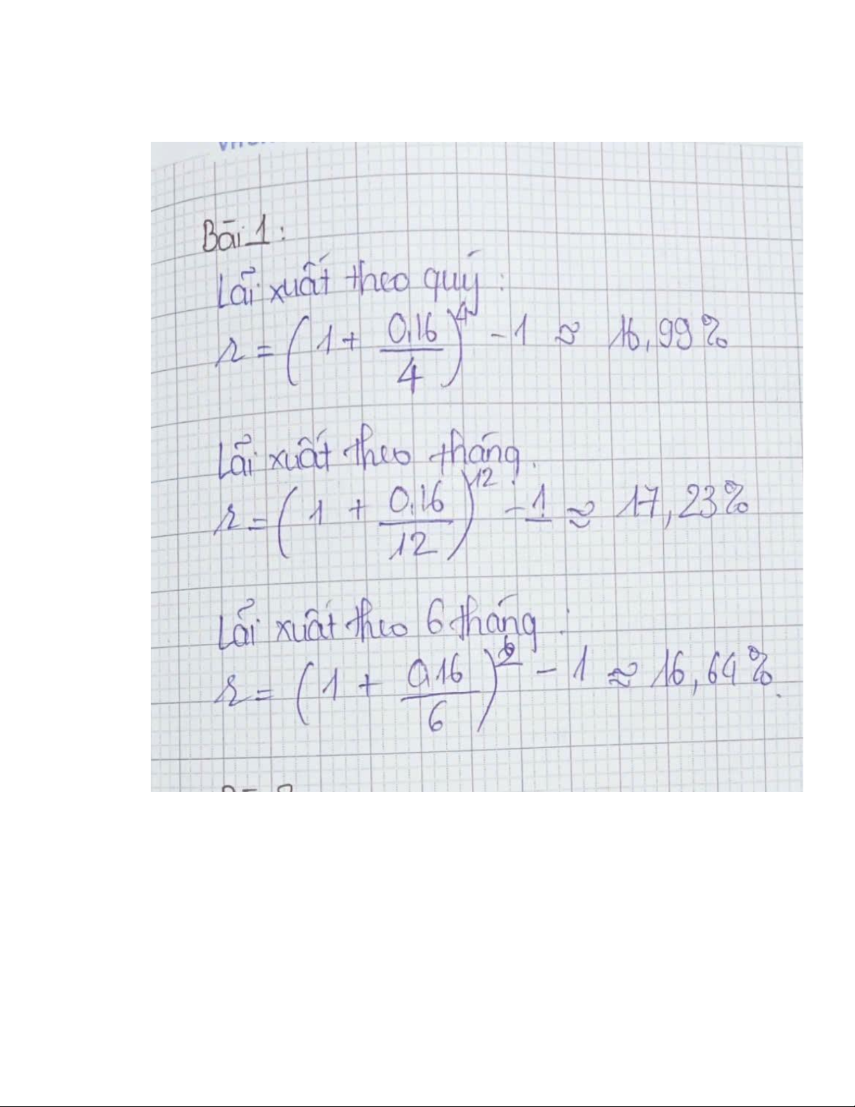 Bài 1: Cho lãi suất danh nghĩa 16%/năm. Xác định lãi suất tương đương theo quý, tháng, 6 tháng?