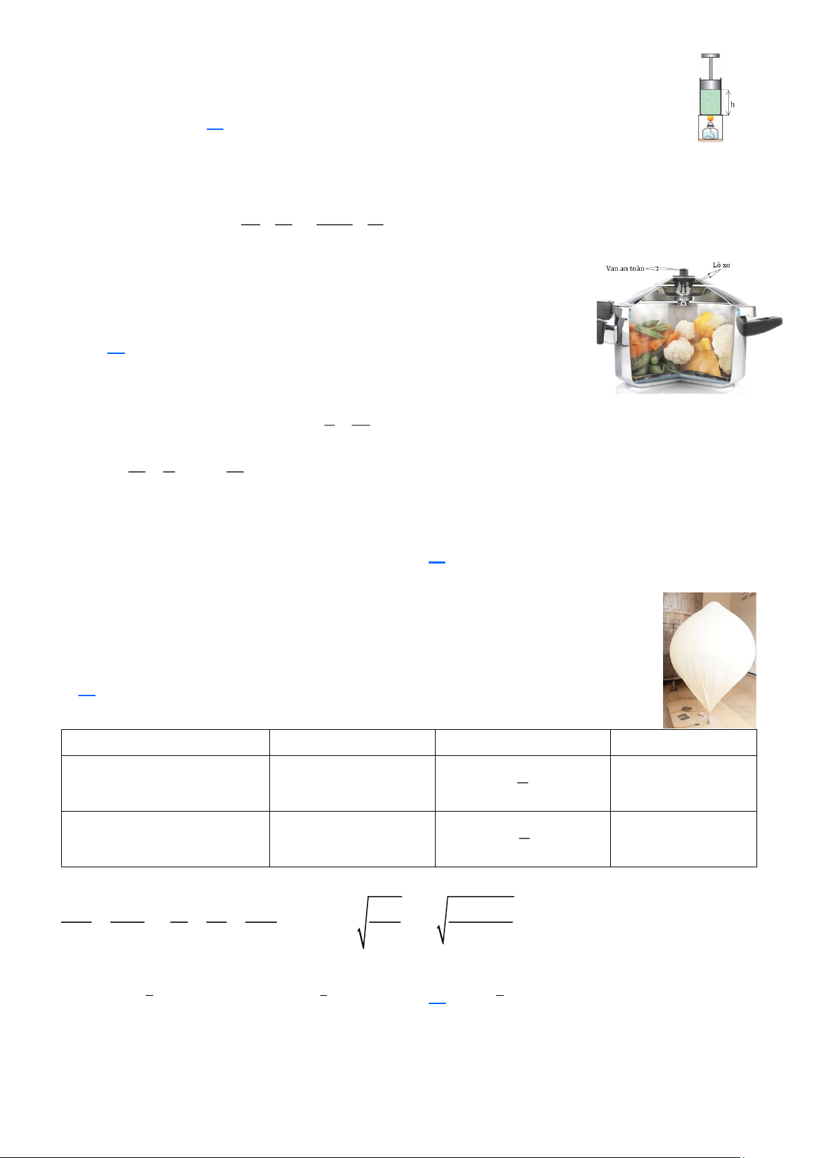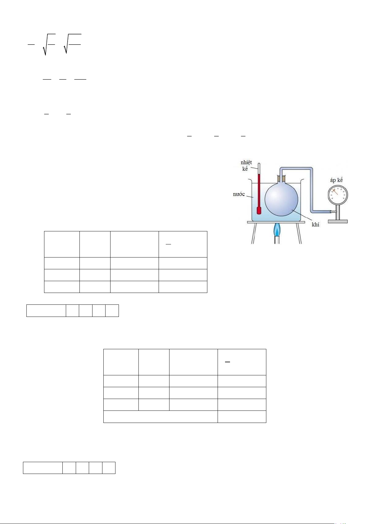 Tỉ số p/T có giá trị trung bình xấp xỉ (làm tròn đến phần nguyên) bằng bao nhiêu Pa/K? Đáp án: 3 3 2 Hướng dẫn 𝑝 t (oC) T (K) p (x105 Pa) (𝑃𝑎/𝐾) 𝑇 28 301 1,00 332,23 58 331 1,10 332,33 75 348 1,15 330,46 Trung bình 331,67