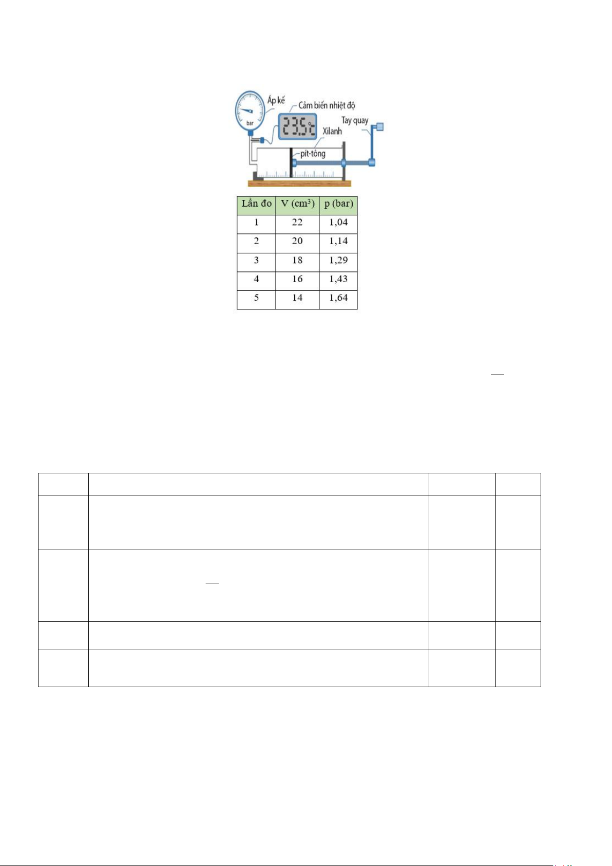 Với kết quả thu được ở bảng bên, công thức liên hệ áp suất b theo thể tích là 23 p = , p đo bằng bar ( 5 1bar = 10 Pa ),V đo Đ V bằng 3 cm . c