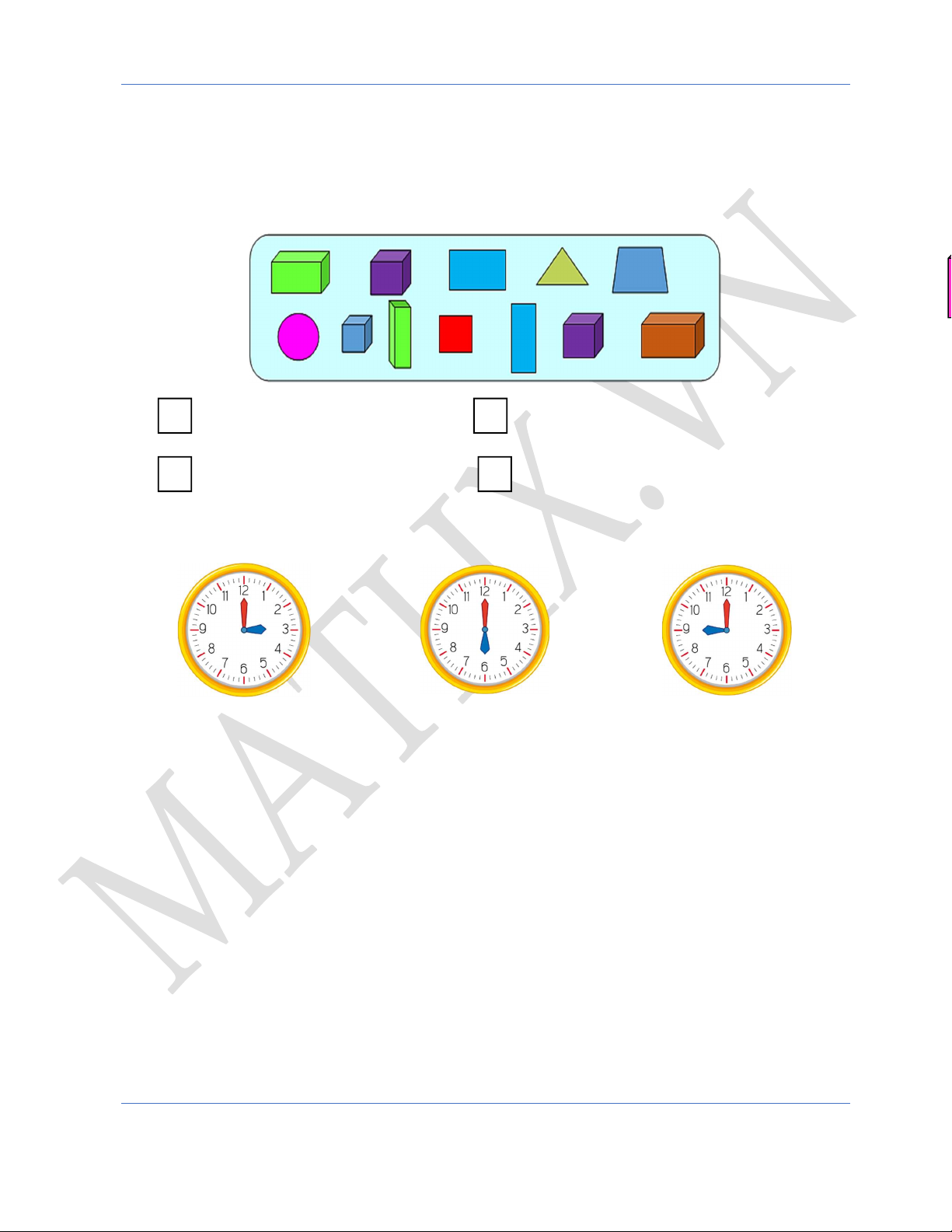 Câu 1. (1 điểm) Quan sát hình sau và cho biết? Có khối lập phương Có khối hộp chữ nhật Có hình vuông Có hình chữ nhật