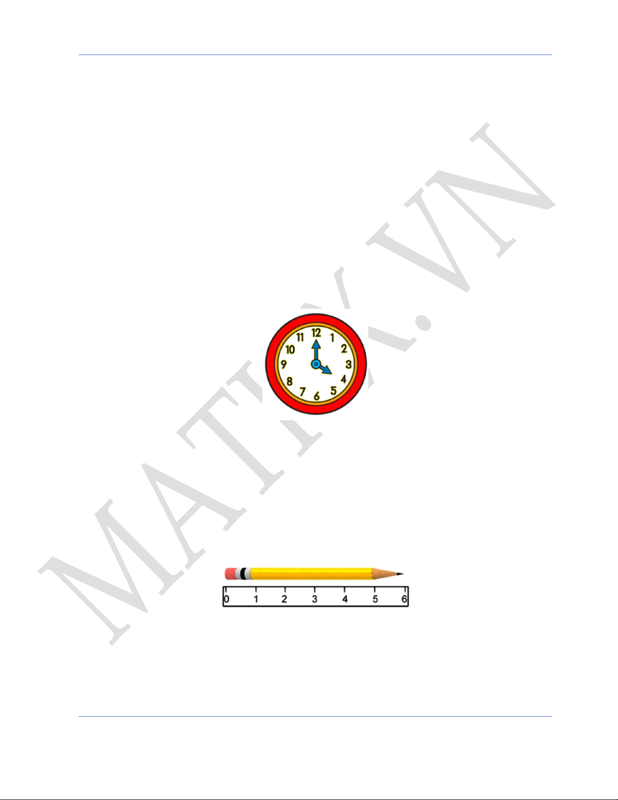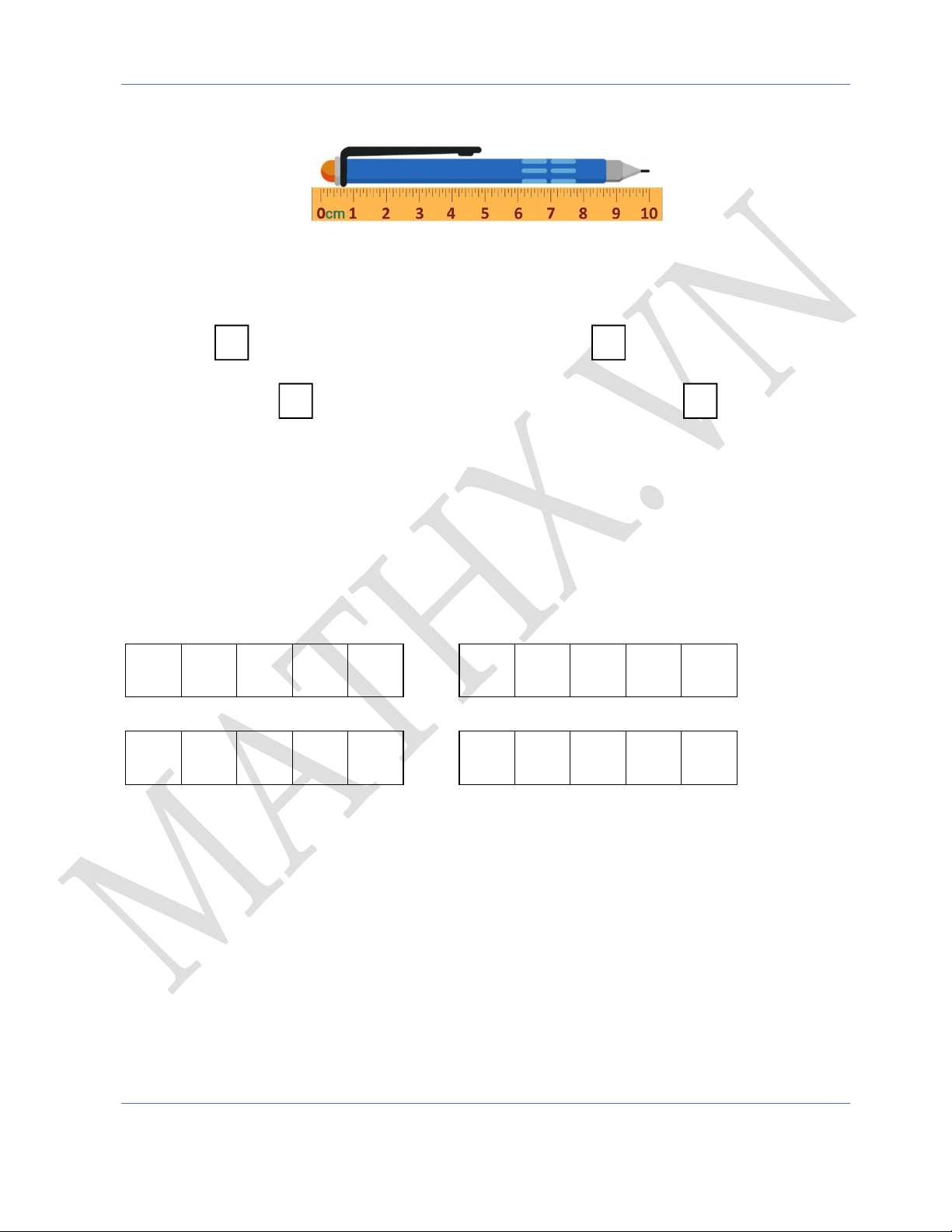 Câu 5. (1 điểm) Độ dài của chiếc bút chì dưới đây theo đơn vị xăng-ti-mét là: A. 6cm B. 5cm C. 4cm D. 3cm