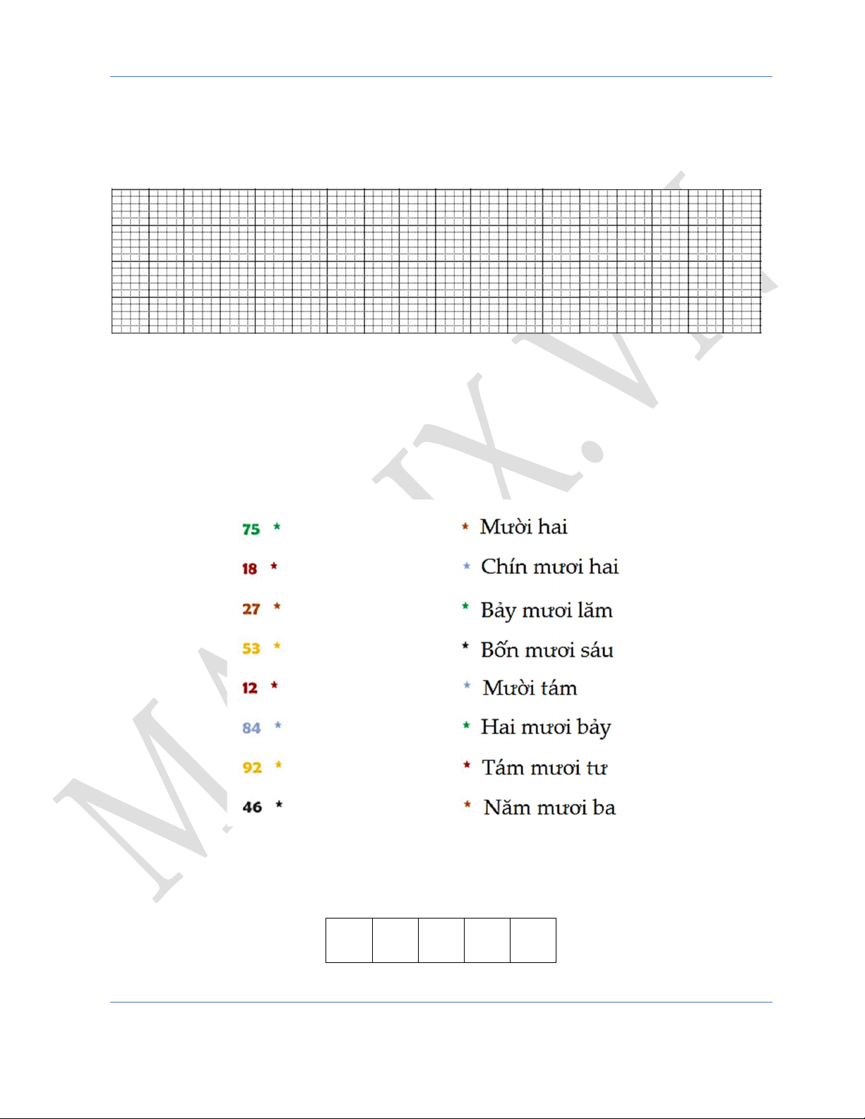 Học toán online hiệu quả cùng thầy Trần Hữu Hiếu Hotline: 091.269.8216 1 www.mathx.vn Toán lớp 1 Câu 6. (1 điểm) a) Viết đúng. Năm mươi tư: …………