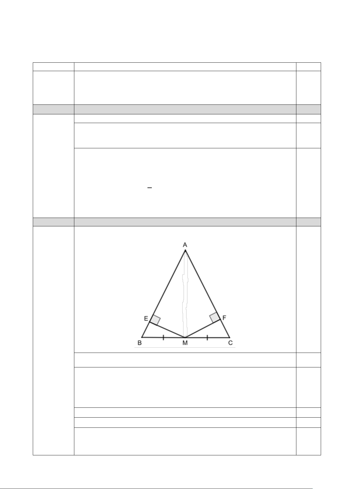 cân tại A nên = B C . 0,25 Xét B ∆ M E và C ∆ M F có: = 0 BEM CFM = 90 (gt) MB = MC (gt) 0,5 =