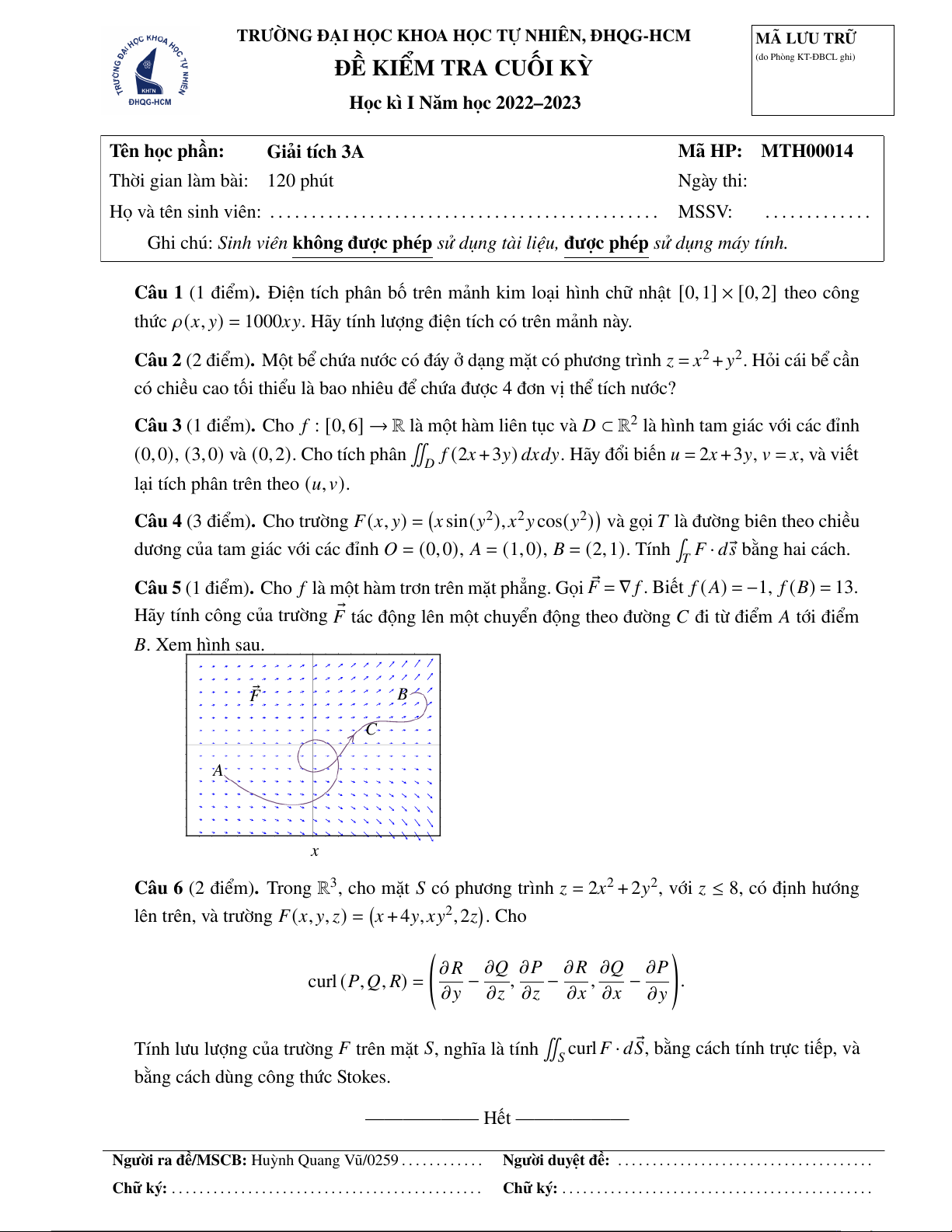 Học kì I Năm học 2022–2023 Tên học phần: Giải tích 3A Mã HP: MTH00014