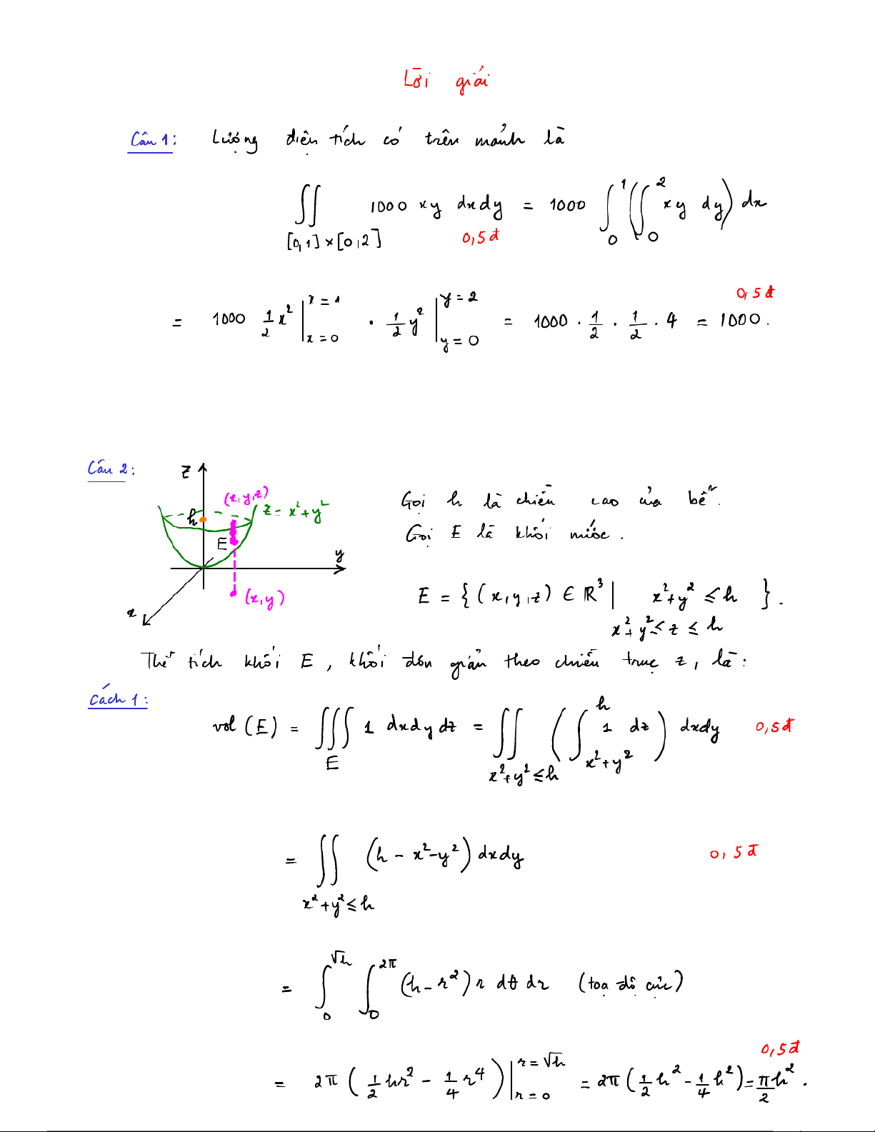 Câu 2 (2 điểm). Một bể chứa nước có đáy ở dạng mặt có phương trình 𝑧 = 𝑥2 + 𝑦2. Hỏi cái bể cần