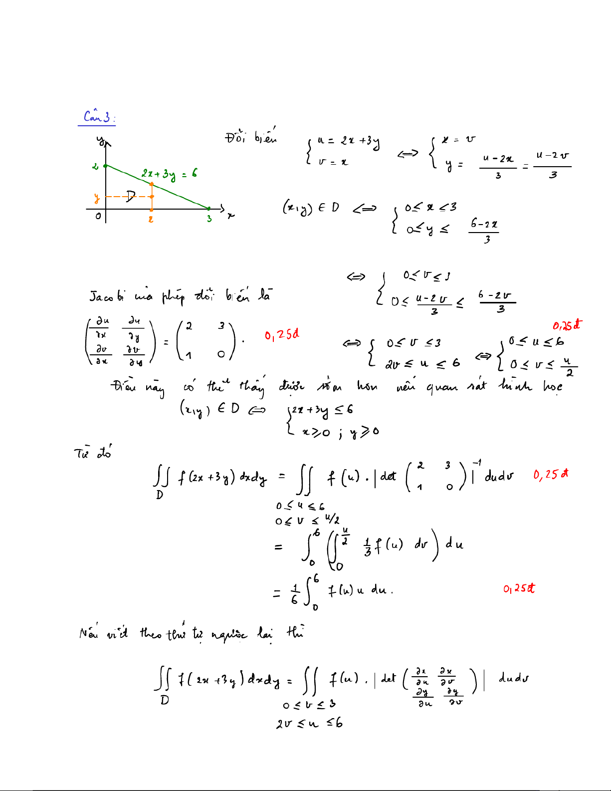 , ). Cho tích phân ∬ 𝑓 (2𝑥 + 3𝑦) 𝑑𝑥𝑑𝑦. Hãy đổi biến 𝑢 = 2𝑥 + 3𝑦, 𝑣 = 𝑥, và viết 𝐷