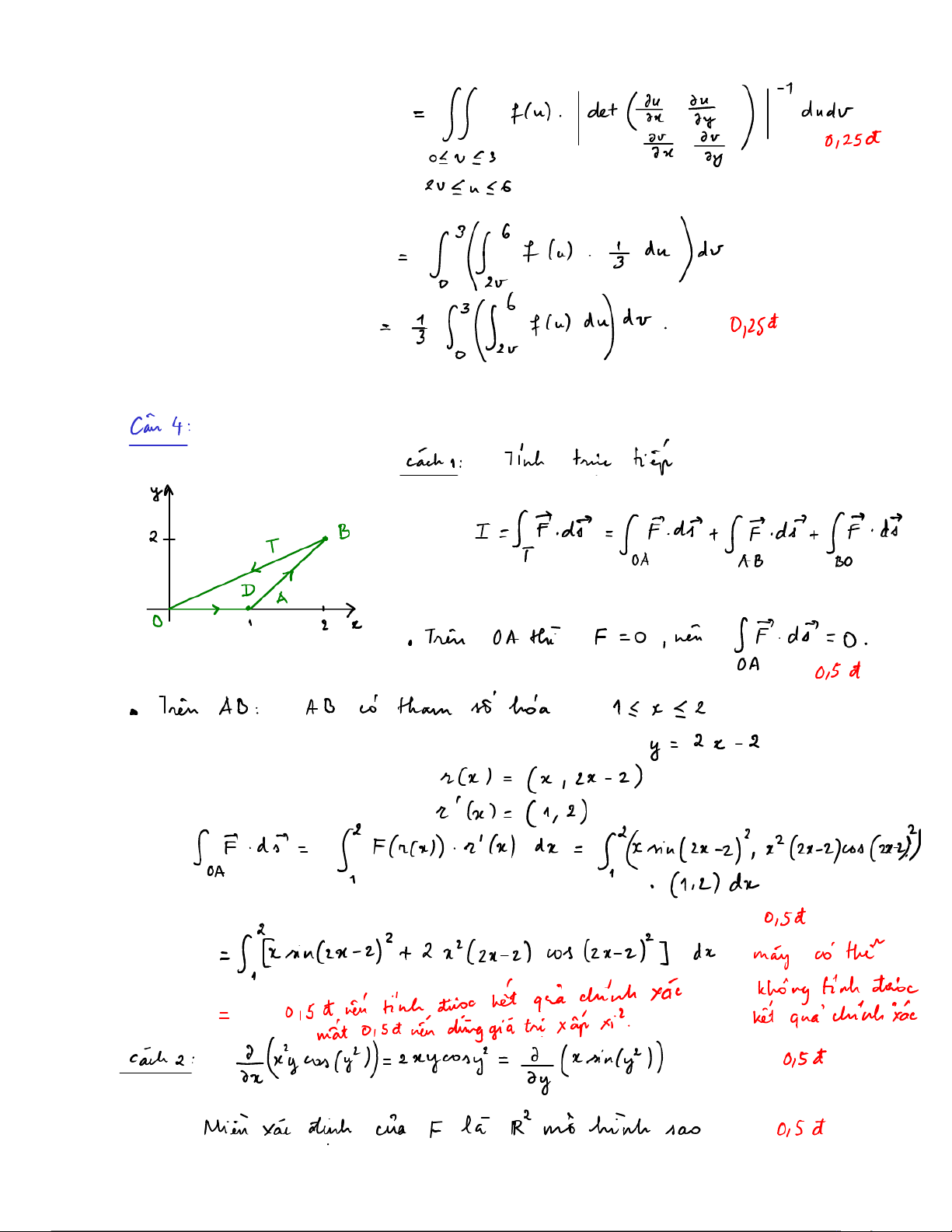 Câu 3 (1 điểm). Cho 𝑓 : [0,6] → R là một hàm liên tục và 𝐷 ⊂ R2 là hình tam giác với các đỉnh (0 0 , ), (3 0 , ) và (0 2