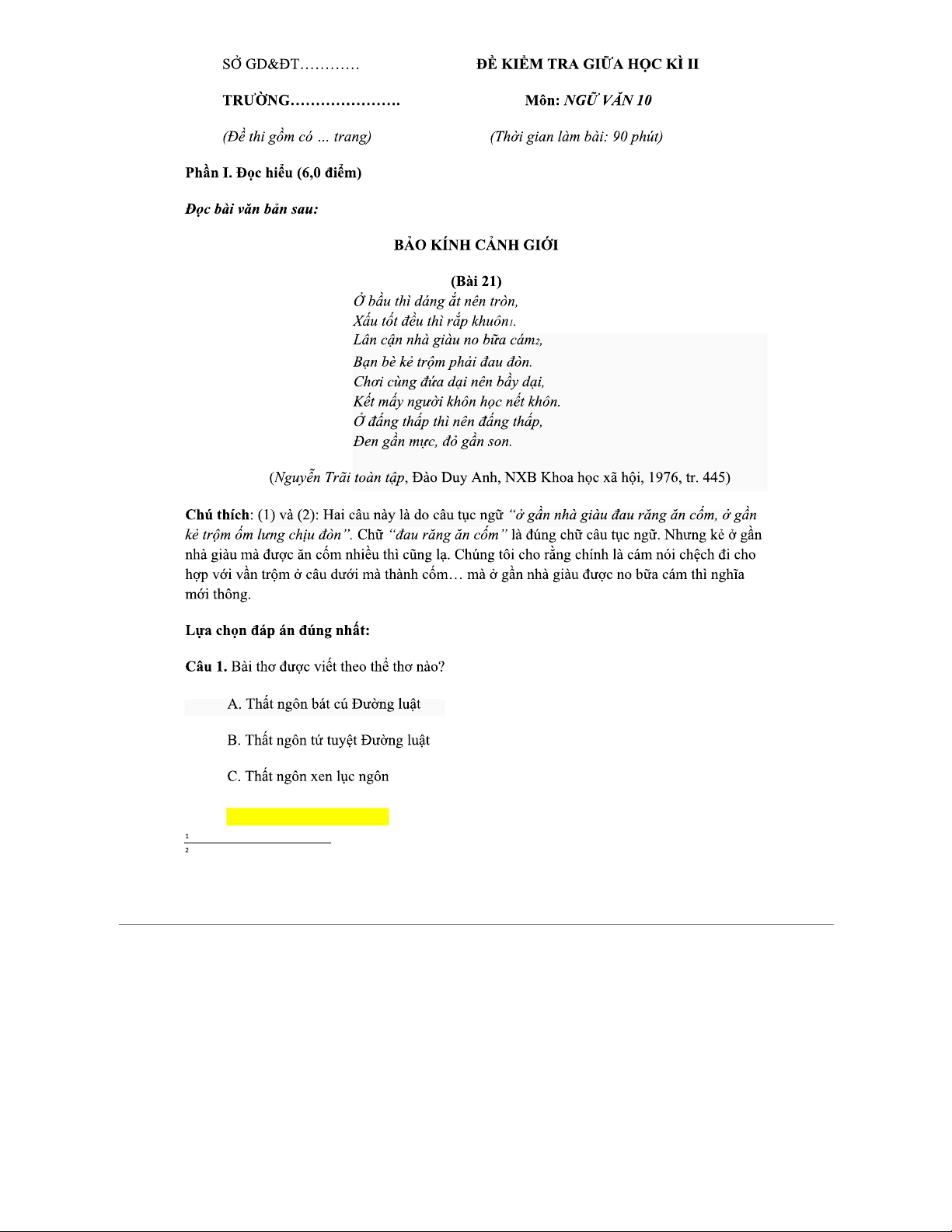 ĐỀ KIỂM TRA CUỐI KỲ II - NGỮ VĂN 10 - Nguyễn Trãi 2023