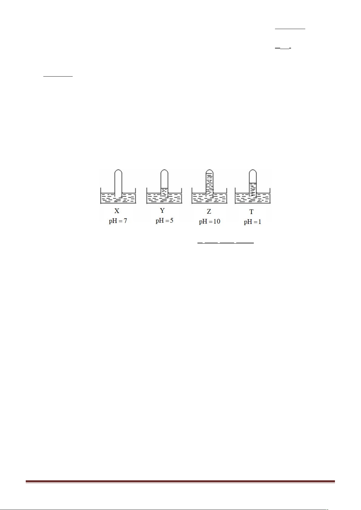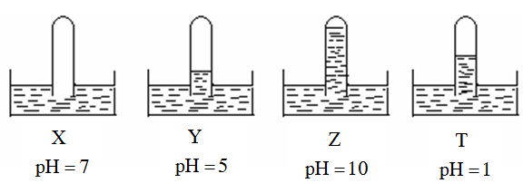 Câu 17.VD. Có 4 ống nghiệm, mỗi ống đựng một chất khí khác nhau, chúng được úp ngược trong các chậu nước X, Y, Z, T. Kết quả thí nghiệm được mô tả bằng hình vẽ sau: