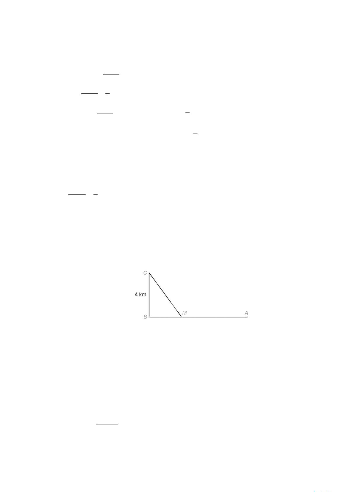 Đặt 𝑀𝐵 = 𝑥(𝑘𝑚, 0 ≤ 𝑥 ≤ 10), khi đó, 𝐴𝑀 = 10 − 𝑥( km) và 𝑀𝐶 = √𝑀𝐵2 + 𝐶𝐵2 = √𝑥2 + 16( km)