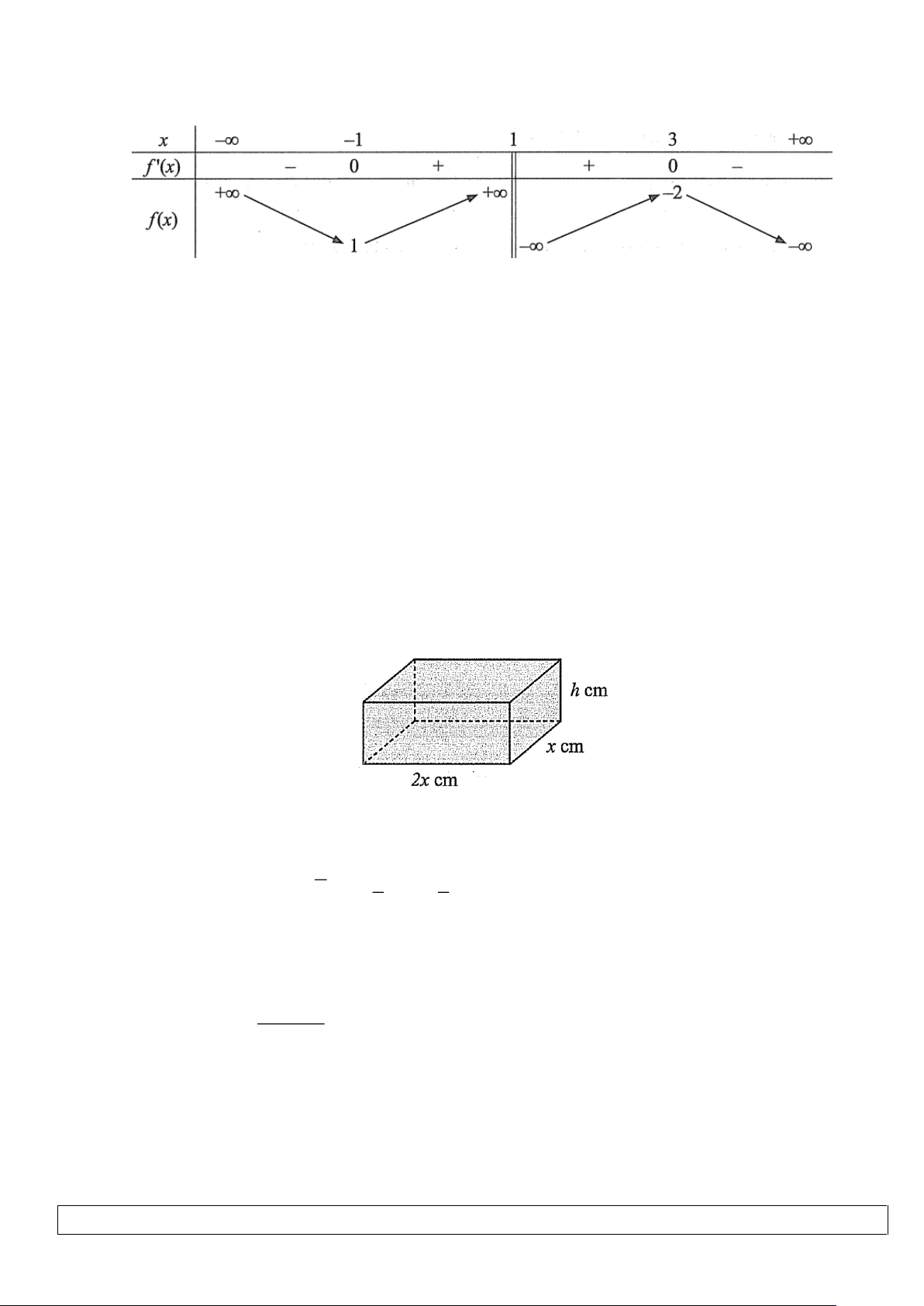 Câu 11. Bảng biến thiên sau là của một trong bốn hàm số sau. Hỏi hàm số đó là hàm số nào? Trang 2 2 x − 2x +1 2 x − 4x + 2 2 x − x + 2 2 x − 3x + 4 A. y = . B. y = . C. y = . D. y = . x + 4 x + 4 −x − 4 −x − 4