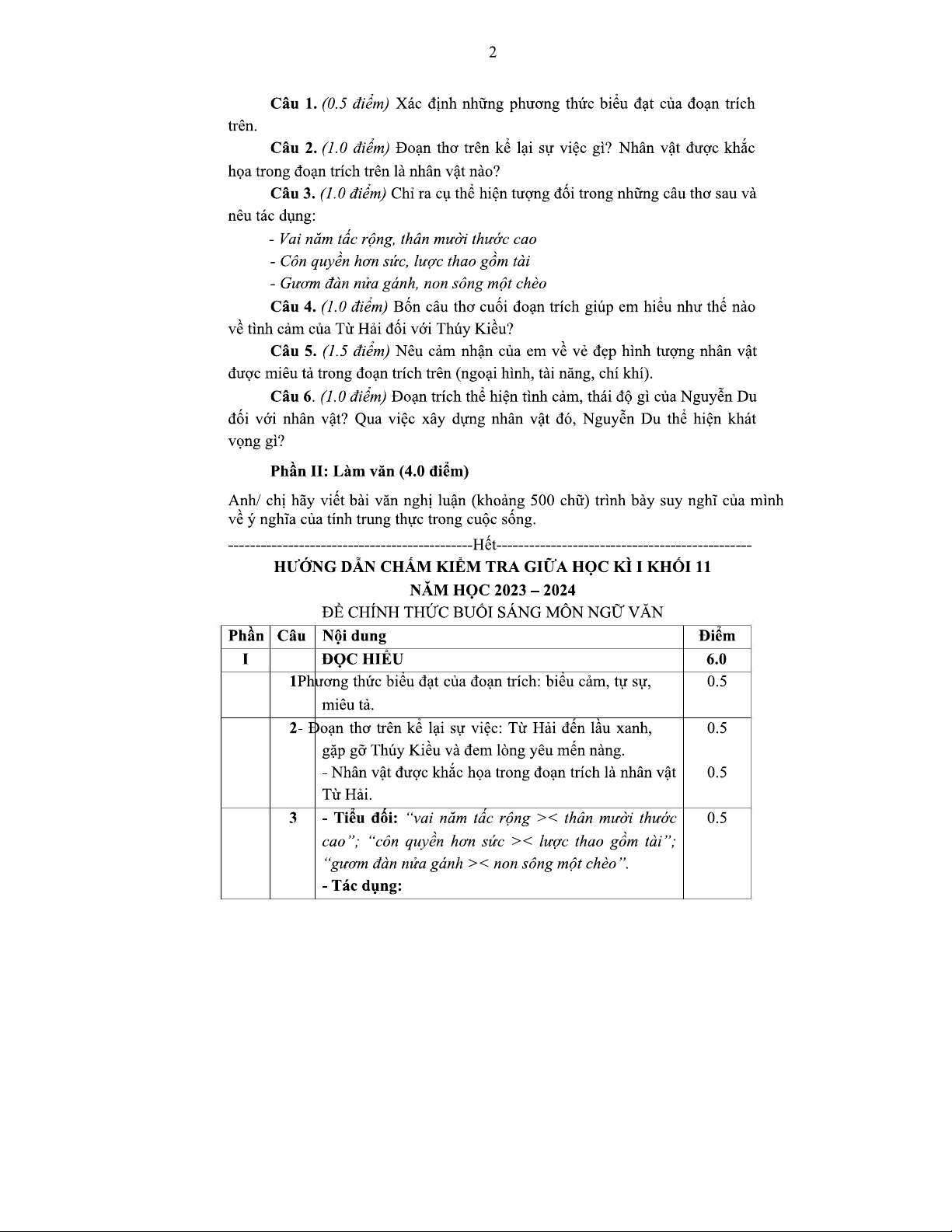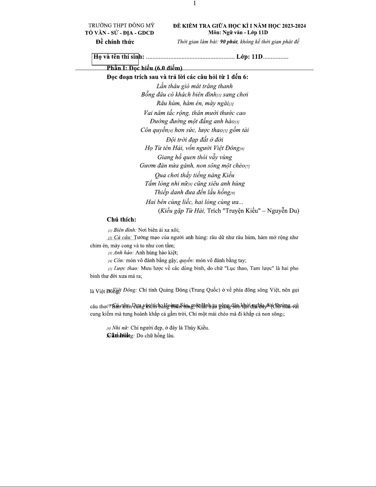 Đề Kiểm Tra Giữa HKI 2023-2024 - Ngữ Văn Lớp 11D