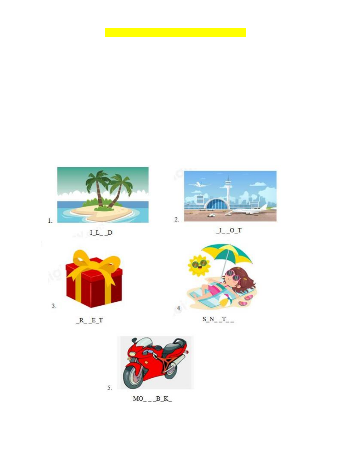 II. Listen and decide if each statement is True (T) or Fasle (F). 1. T 2. F 3. T 4. T 5. F B. VOCABULARY & GRAMMAR I. Look and complete words. 1. ISLAND 2. AIRPORT 3. PRESENT 4. SUNBATHE 5. MOTORBIKE